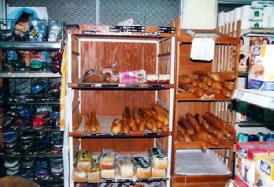 ニューカレドニア、アンスバタビーチ付近には“スーパー”と呼ばれる小さなお店がいくつかあります。「よろず屋」とでもいいましょうか。日用品からおそうざい、チーズ、ワイン、インスタント食品、栓抜き、蚊取り線香など、品ぞろえは豊富。ヌメア市内へ行けば大きなスーパーもありますが、たいていのものはこの小さな“スーパー”で調達できそうです。【写真は店内のビーサン(左)とフランスパン(右)。すごいディスプレイ!】