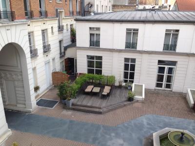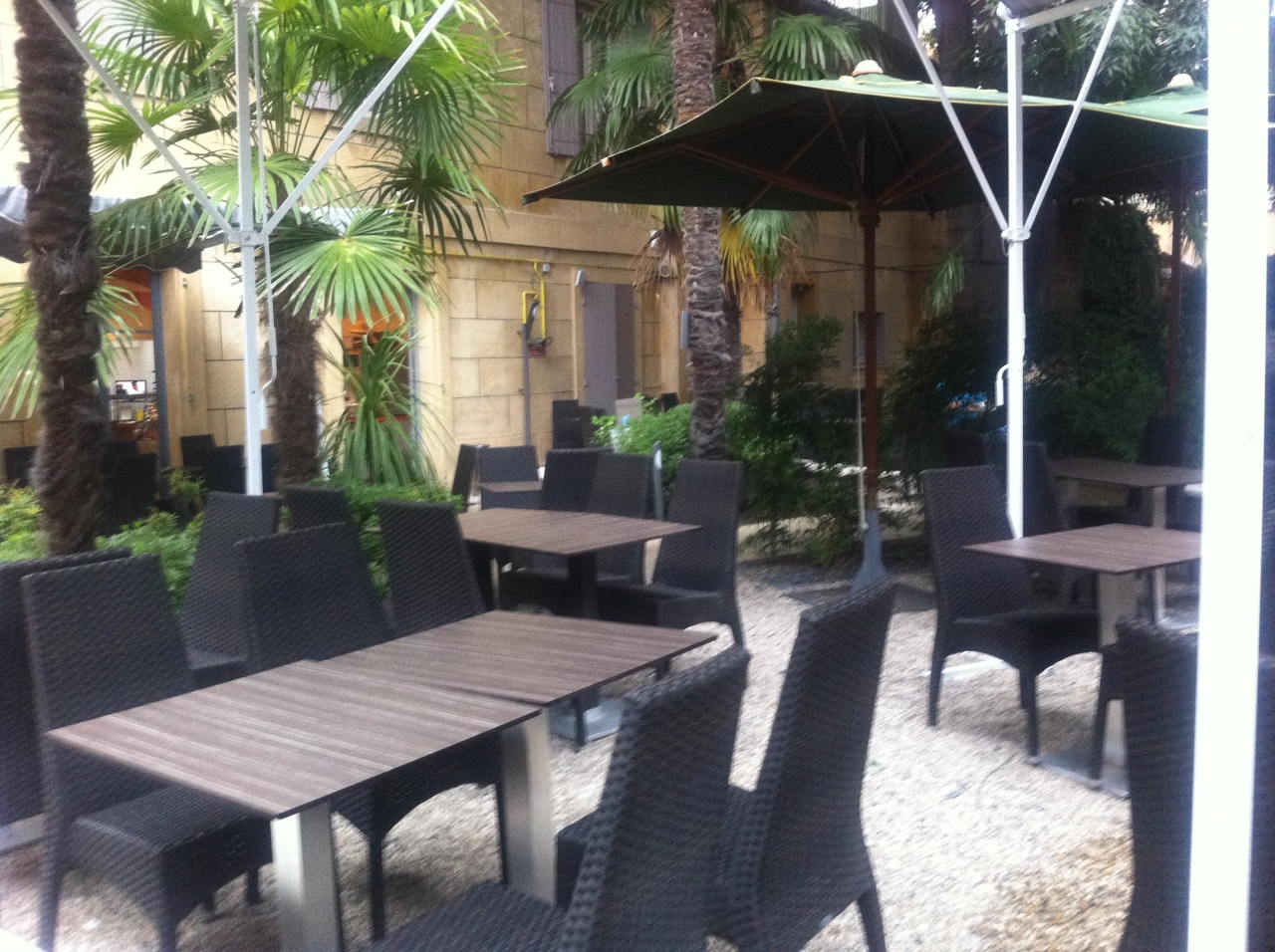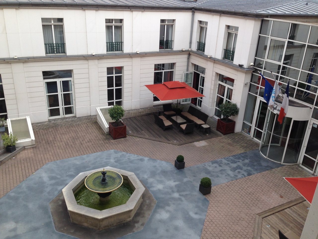 空港からエールフランスバスでモンパルナスでおり、徒歩10分くらいです。中庭の先にホテルの入り口があります。1泊してスーツケースを預けて、モンパルナスからTGVでボルドーへ。パリに戻って2泊しました。すべての客室が中庭に向いてコの字型に建っています。ホテル周辺にはいろいろなお店があり、老舗カフェで有名なVivin交差点もすぐです。