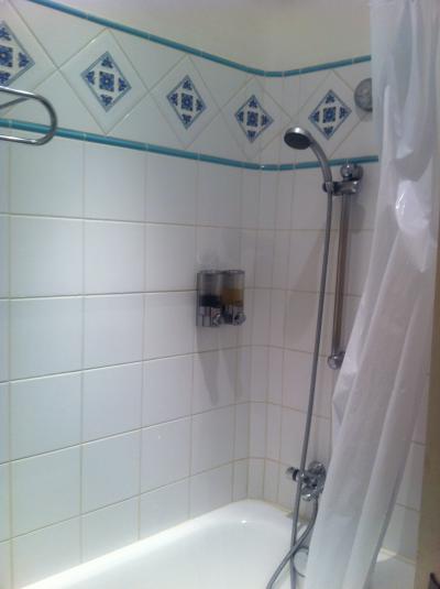チェックインすると、スタッフが客室まで案内してくれました。中庭を通って離れのような建物の2Fの客室でした。客室は薄い青色、クリーム色の内装でファブリックはプロバンス柄でした。スーツケースを2つ広げると狭いかもしれません。バスルームは可愛らしい雰囲気のタイル張りでした。