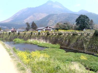 由布院の街を流れる大分川から望む由布岳。川辺には菜の花が満開でした。大...