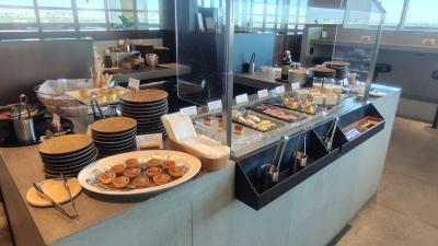 ラウンジのお食事はたち。生ハムやチーズ、冷静スープ、トリュフ香るパイな...
