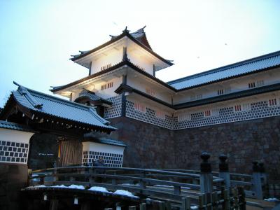 夕方薄暗くなったころ、ライトアップされていて、門も石垣も幻想的でした。