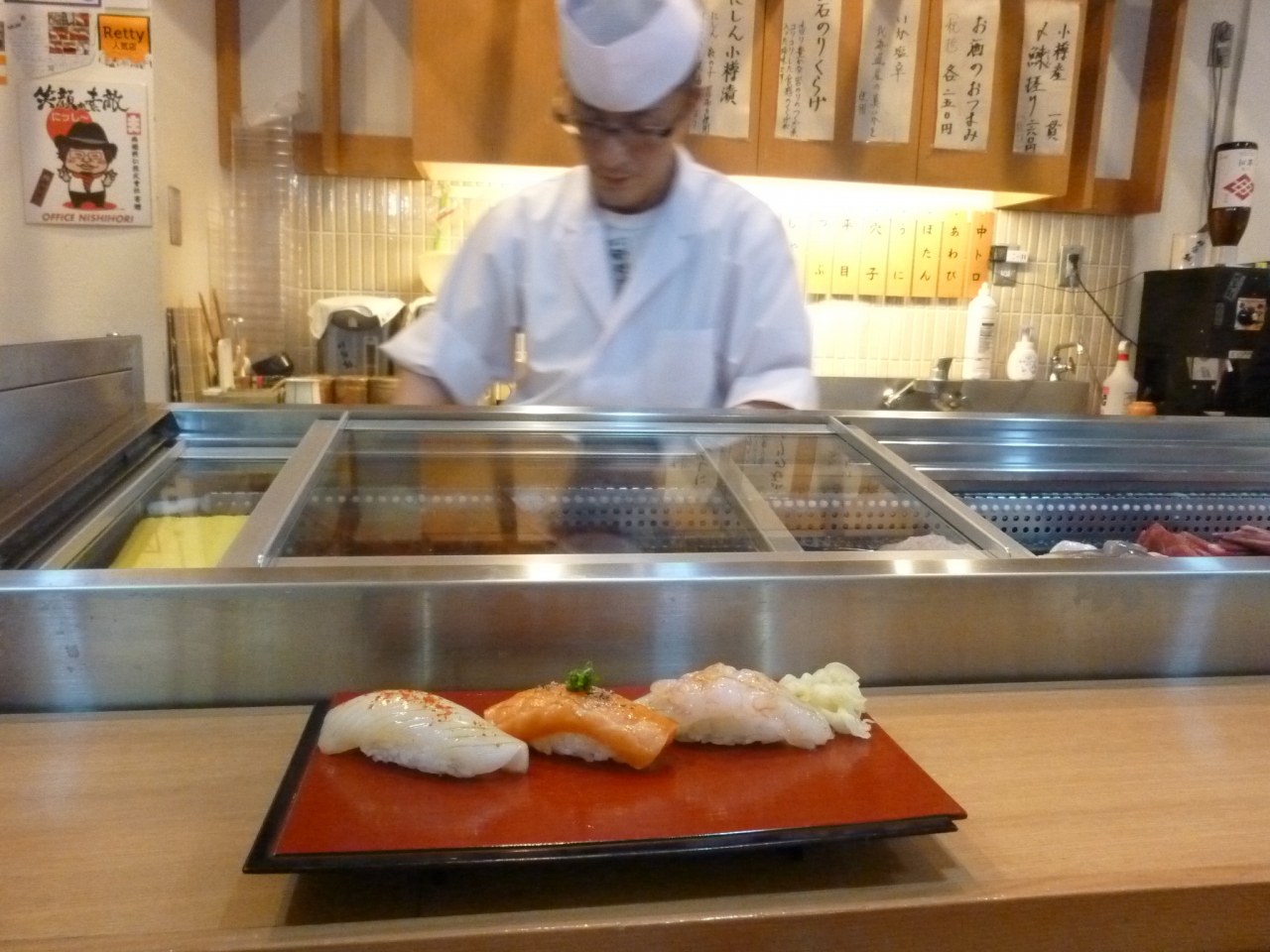 たくさんのお店が並んでいて、ちょい食べができます。中央にテーブルがあり、どの店のものでも、そこにもっていって食べてもOKです。焼き鳥やラクレットチーズやお惣菜などを注文して、中央で食べているグループがありました。地元の人が仕事終わりに来るようです。お寿司もありました。