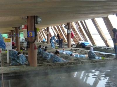 砂楽からバスで40分くらいです。砂蒸し風呂は海の音を聞きながらゆっくりできて最高でした。係の方も優しく、20分くらい横になって、熱さを楽しみました。温泉卵のサービスがあります。砂蒸しと露天風呂の間は、シャトルバスで移動できます。