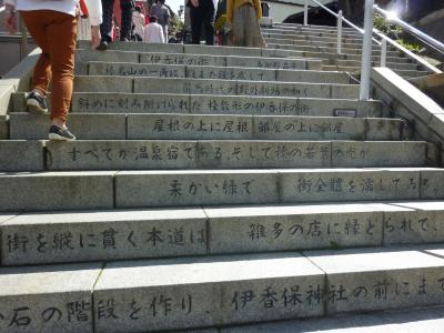石段の中腹にあります。コロナ感染対応のため、座る場所を半分にしていました。歩き疲れたときにここで休めていいですね。みなさんかわるがわる利用されていました。私も少し体が冷えてきたのでここで暖めました。それほど熱くないです。