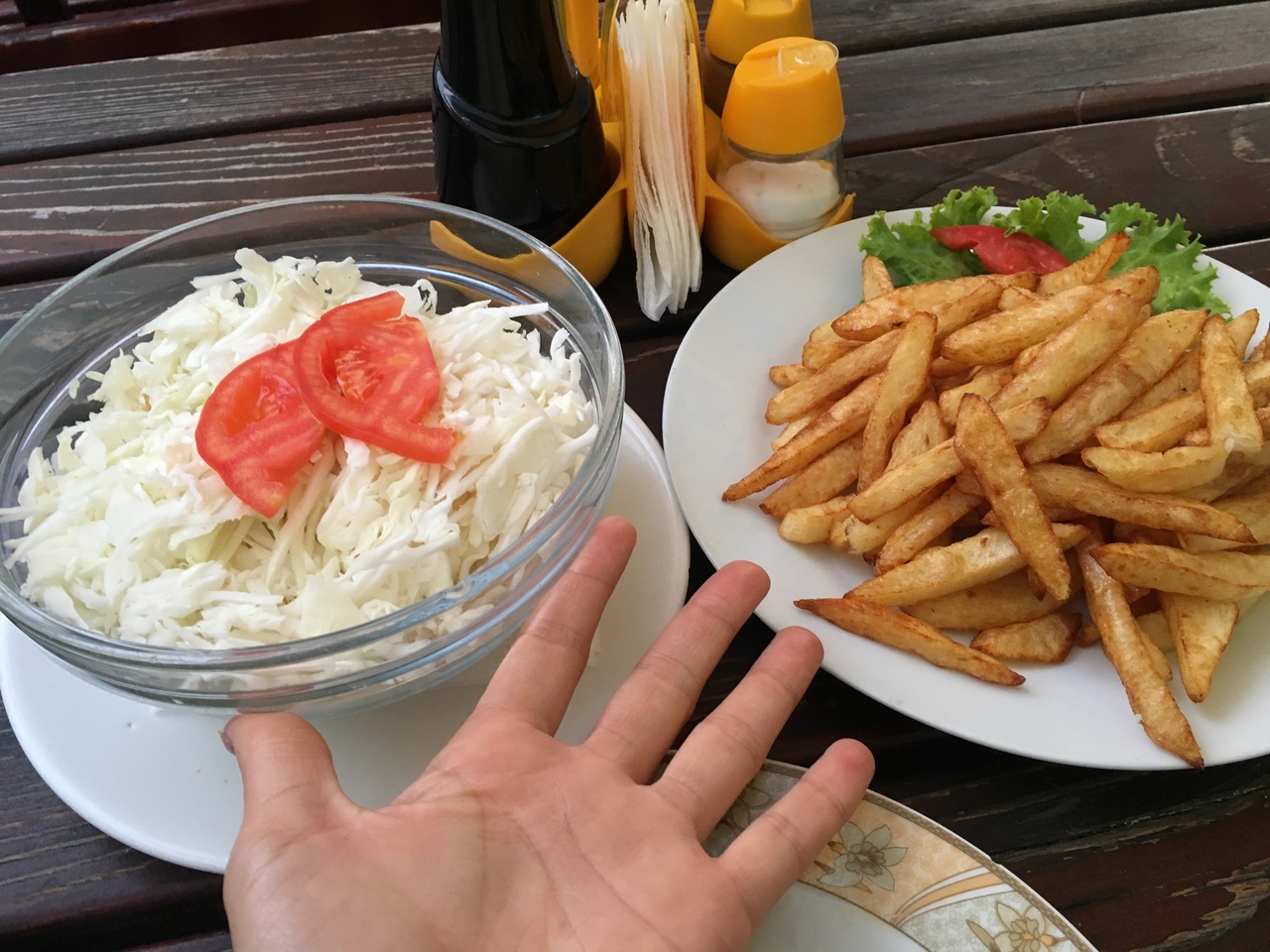 値段の割にボリュームがあり、パンに入った豆のスープはびっくりするほどの大きさ。ただし料理の味は全体的に大味で、サラダもドレッシングなどなくレモンと塩が出されたのみ。