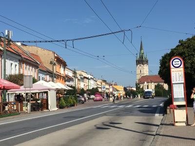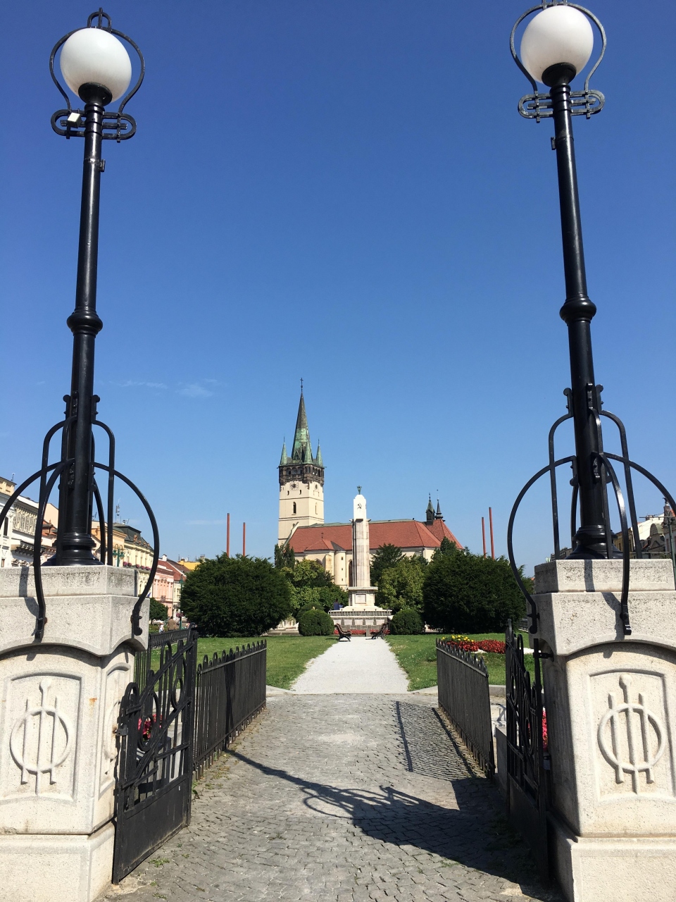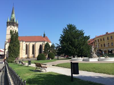 プレショフの中央広場に建つ黄色い色と高い尖塔が印象的な教会。