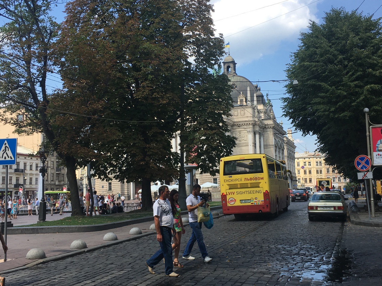 リヴィヴの旧市街地の西を縦に貫く自由大通り。かつては川だったため道幅は広々としています。