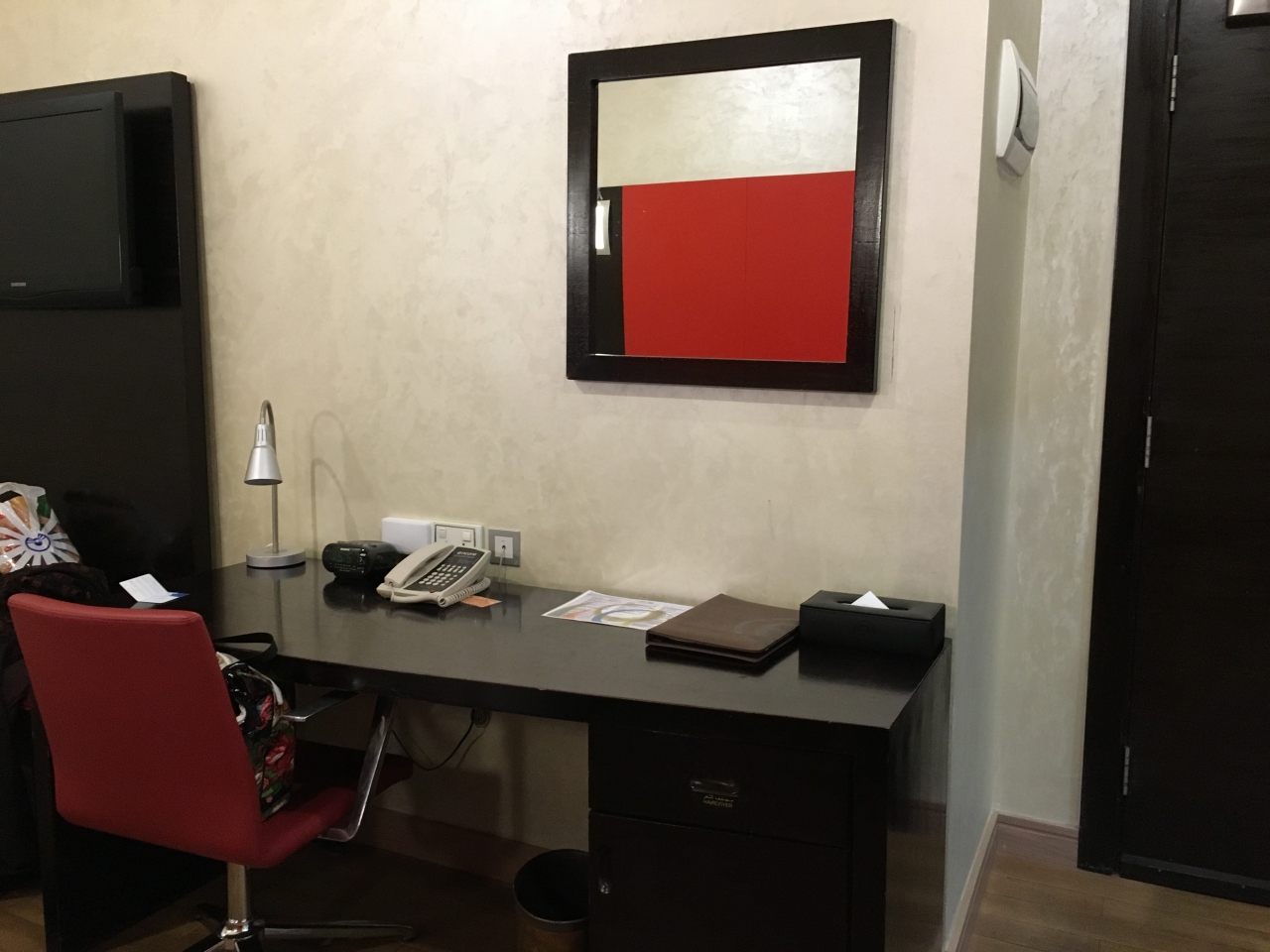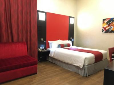 カタール航空からトランジットホテルとして指定されているだけあり、短期で泊まるには最適の中型ホテル。ロビーと同じく赤を基調とした客室はモダンで広々としており、ソファやデスクもあり居住性はとても良いです。トイレやバスルームも綺麗でスタイリッシュ、ストレスはありません。