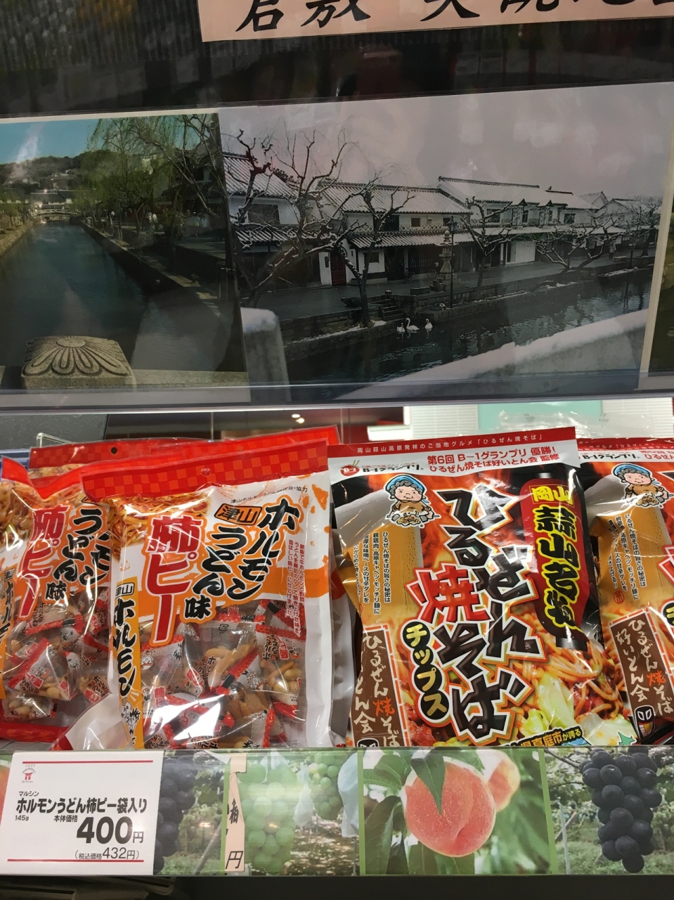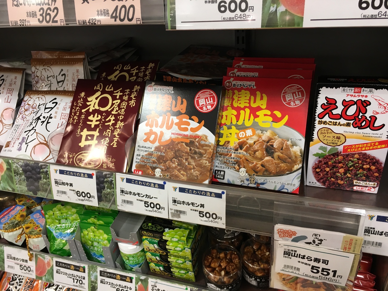 観光に行くと国内外問わずスーパーに立ち寄ることにしているのですが、ここは普通の商品に混ざって岡山県内のご当地グルメ商品がたくさん置いてあり、観光客からするととても楽しく興味深い品揃えでした。