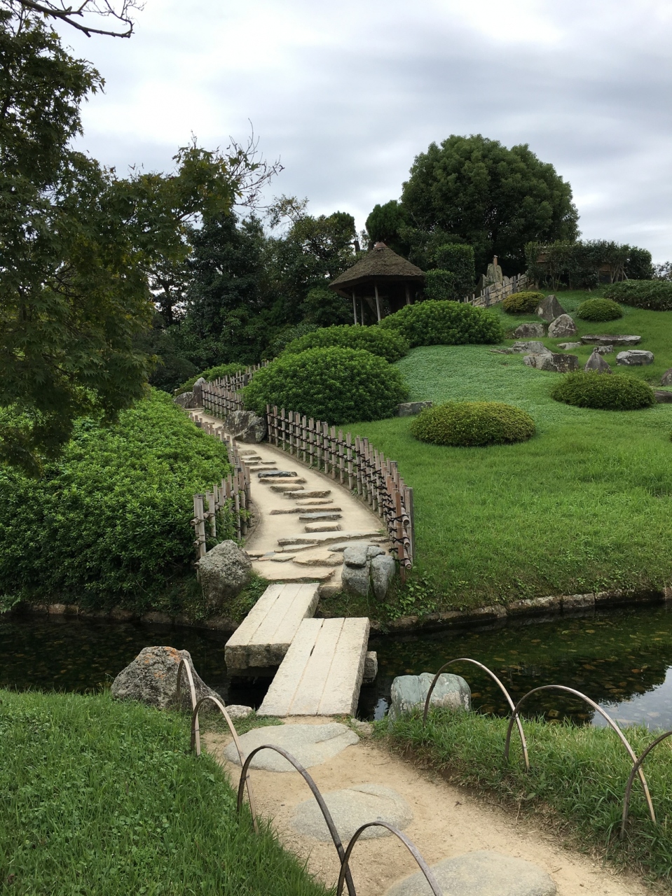 庭園内には、小高い築山あり、池あり、小川あり、菖蒲などのお花たちあり…に加え、米や茶などの栽培もなされており、日本庭園としてはユニークな造りになります。
