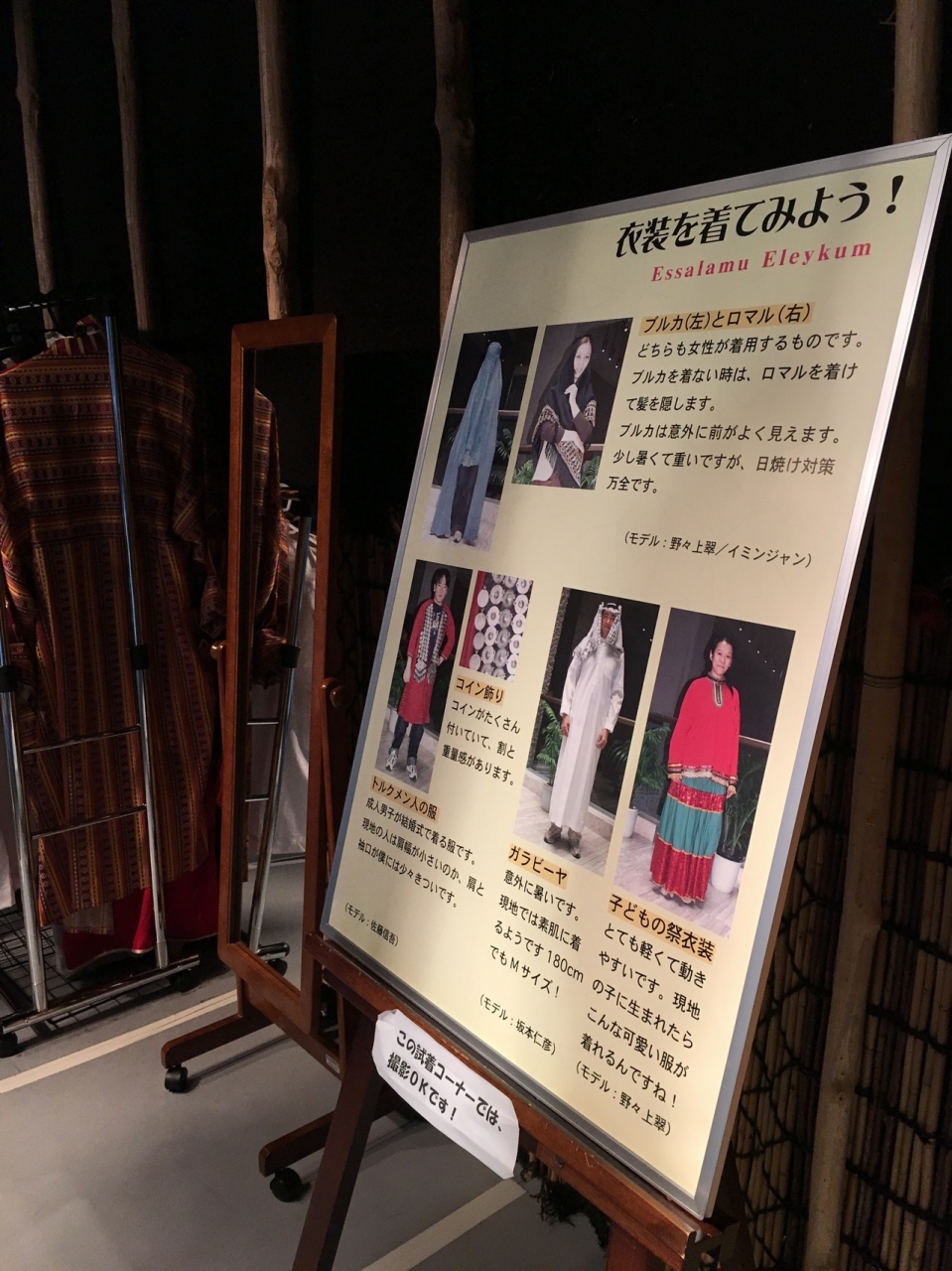 館内は原則写真撮影禁止なので、目に焼き付ける勢いで見学した後にHPの収蔵品検索や画像検索など見ると良いです。また入口にある民族衣装体験コーナーは写真撮影可能でした。企画展も追加料金なしで見学できます。今回は吉竹めぐみさんの写真群でした。