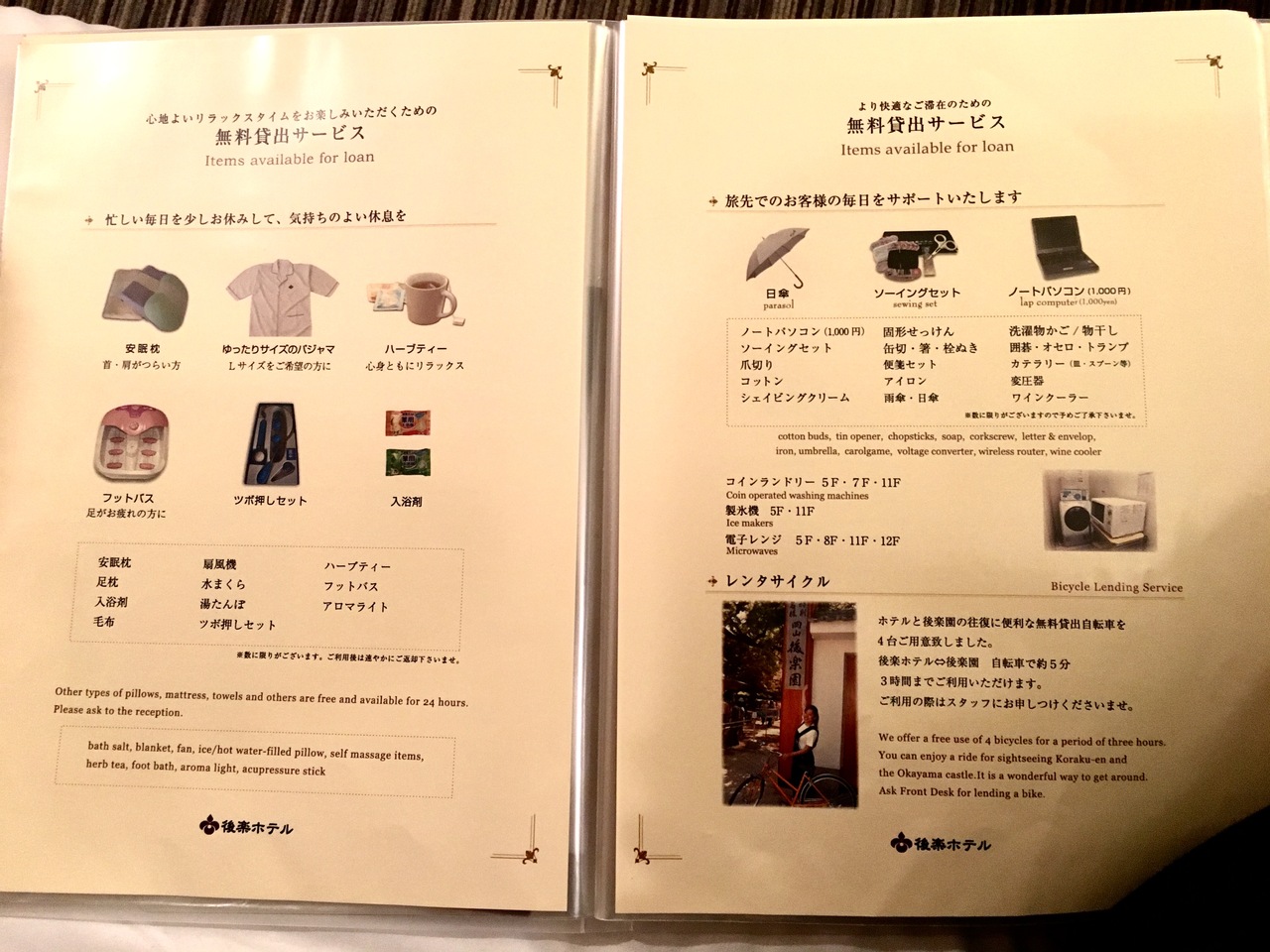 ベッドと布団の質、無料レンタサイクル、アロマ・入浴剤・ハーブティーを含むアメニティの無料サービス、スタッフ手作りのテーマ別岡山市内マップ、各階の共用部に設けられたアート作品、スタッフ選書のミニライブラリー、コインランドリー&電子レンジ、手作り豆腐が美味しい朝食、コンビニ・薬局・クリニック併設の安心感etc・・・