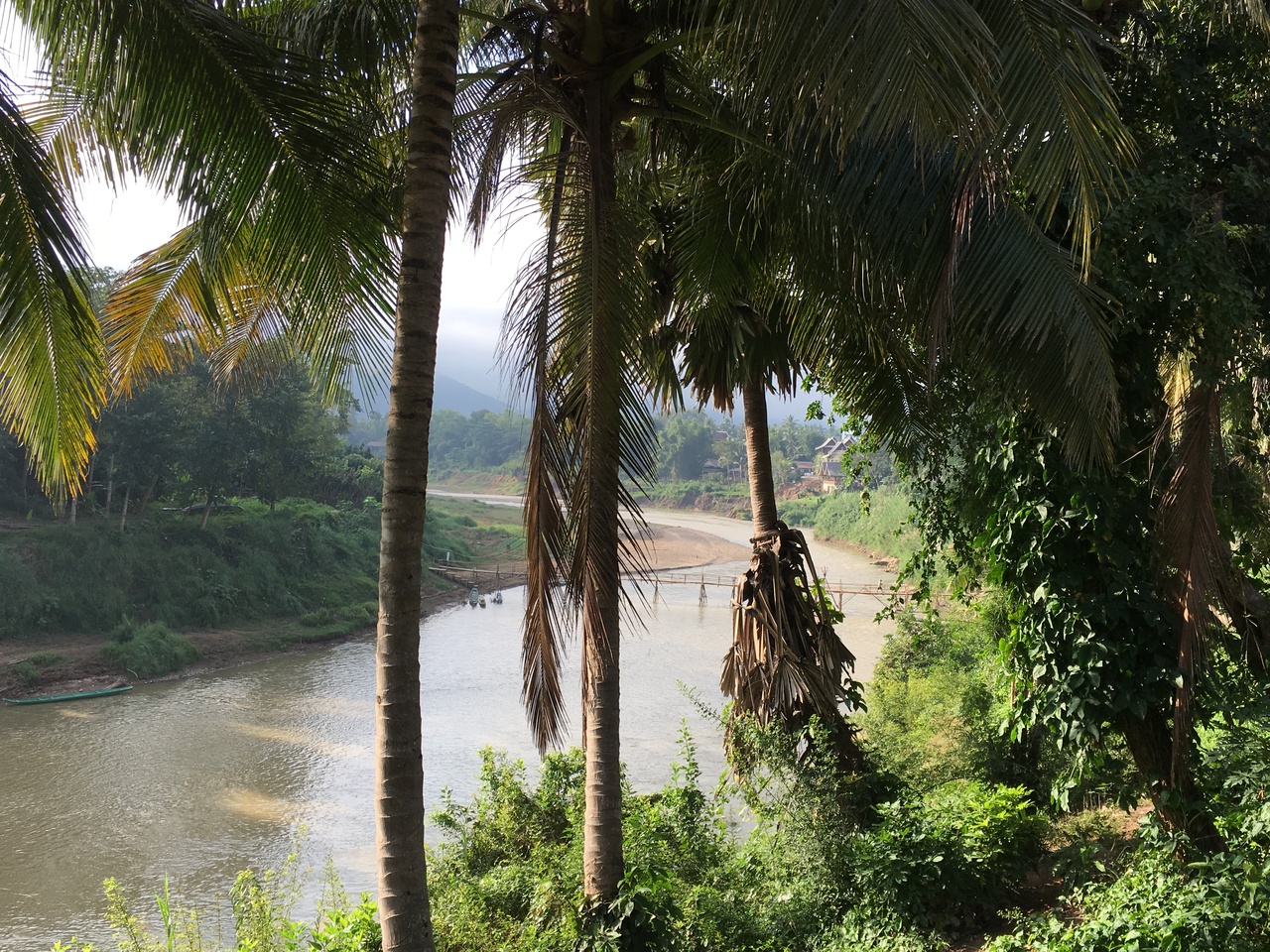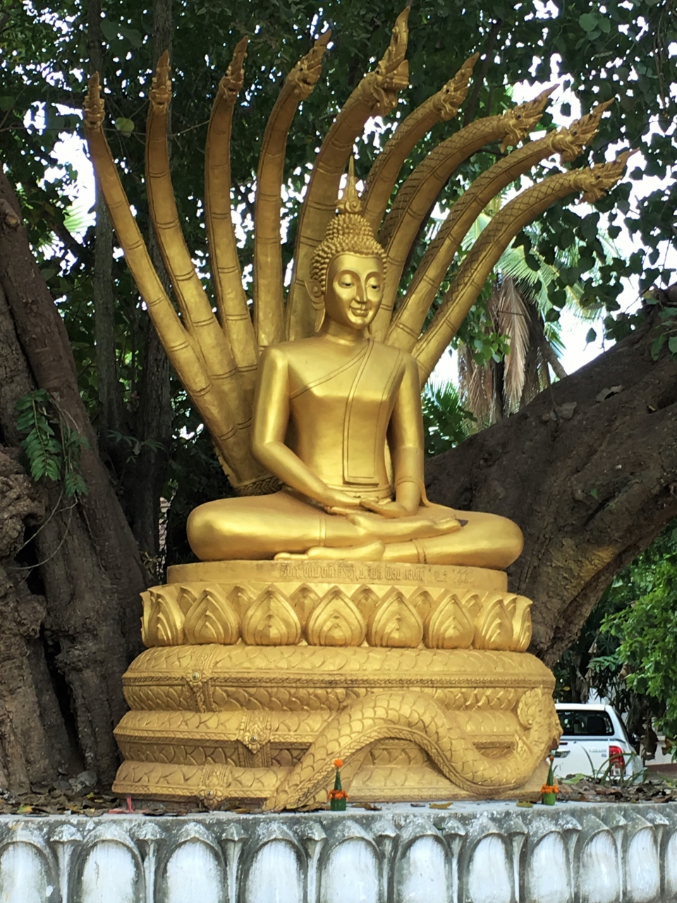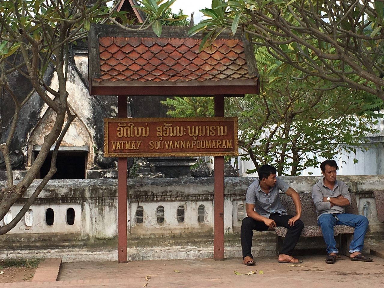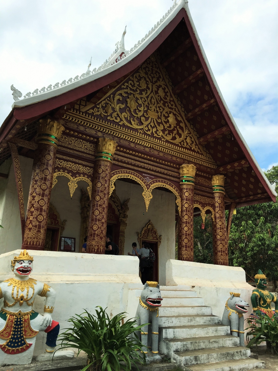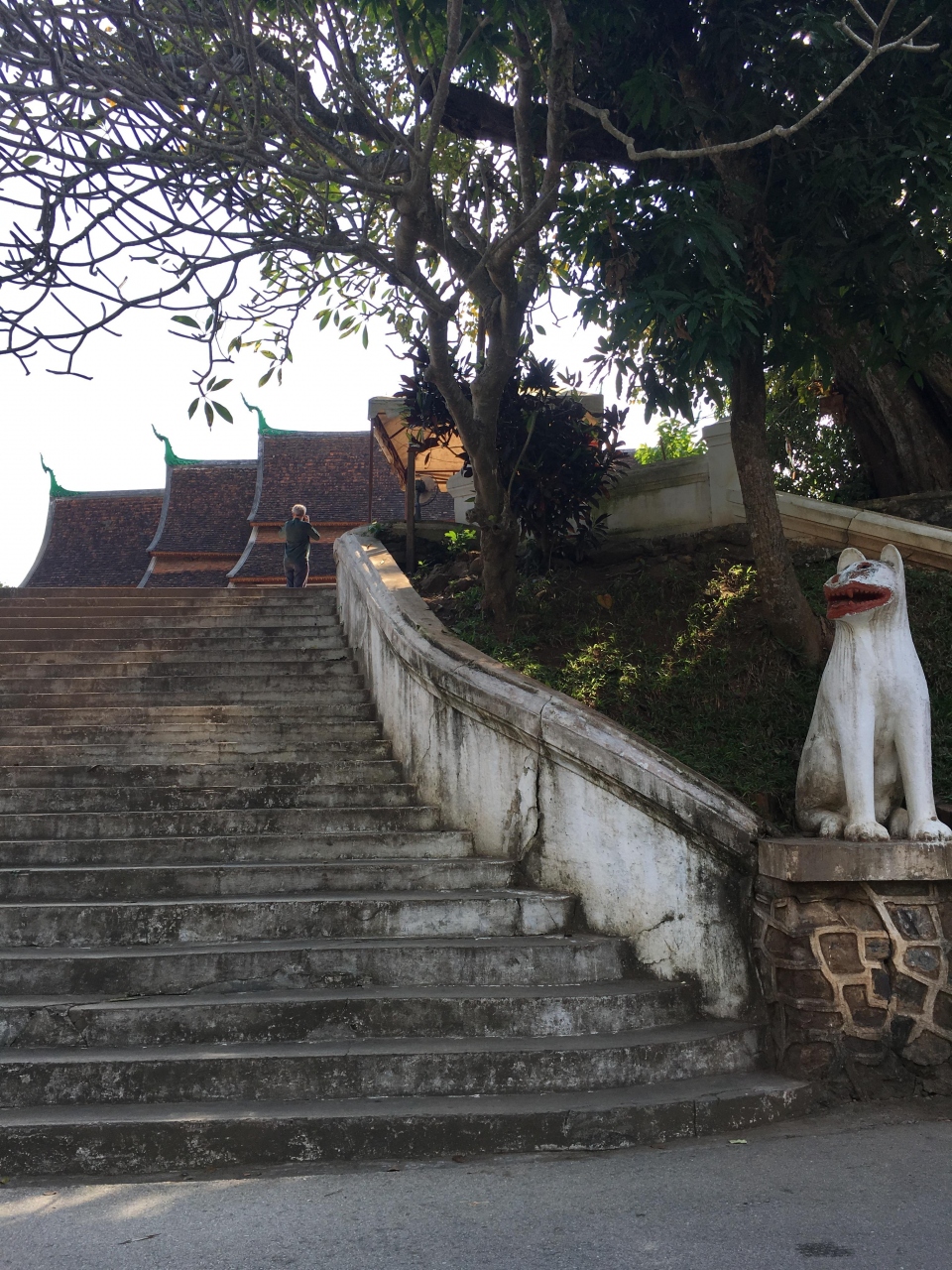 ルアンパバーン北東部、メコン川とナムカーン川の合流地点近くにあるお寺です。町の中心部からは歩いて10分もあればたどり着けると思います。入口には白い狛犬が立っているのですぐ分かります。
