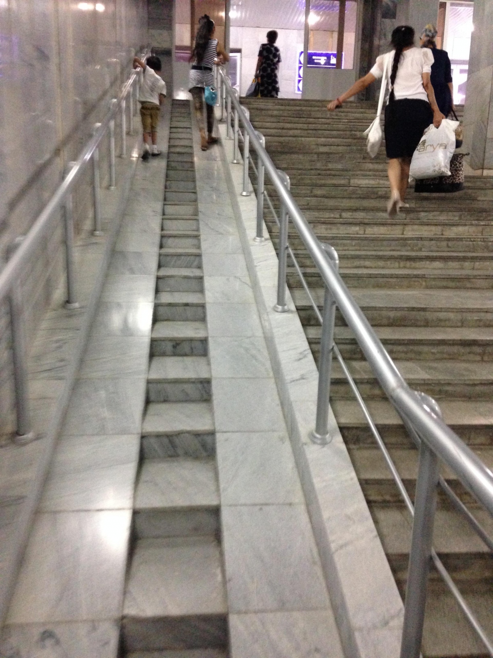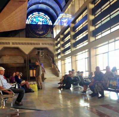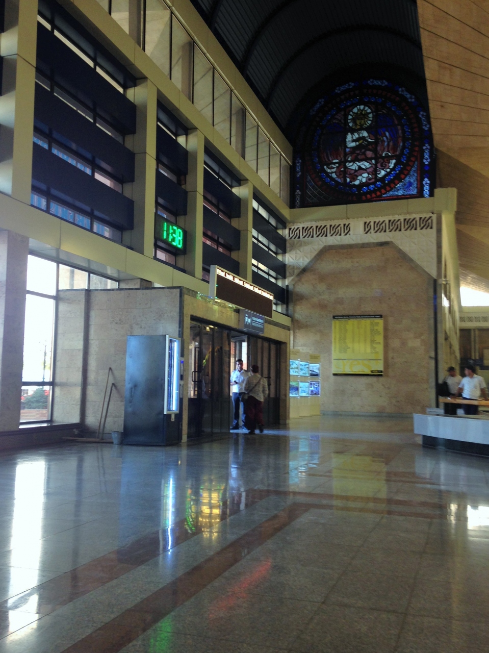 サマルカンド駅はかなり大きな造りですが、売店や設備はあまり大したことはなく、旧ソ連圏の鉄道駅らしくステンドグラスの装飾などのゴージャスな内装が楽しめます。ただし昼間でも薄暗いのが残念。構内に入るためにはチケットとパスポートチェックが必要です。
