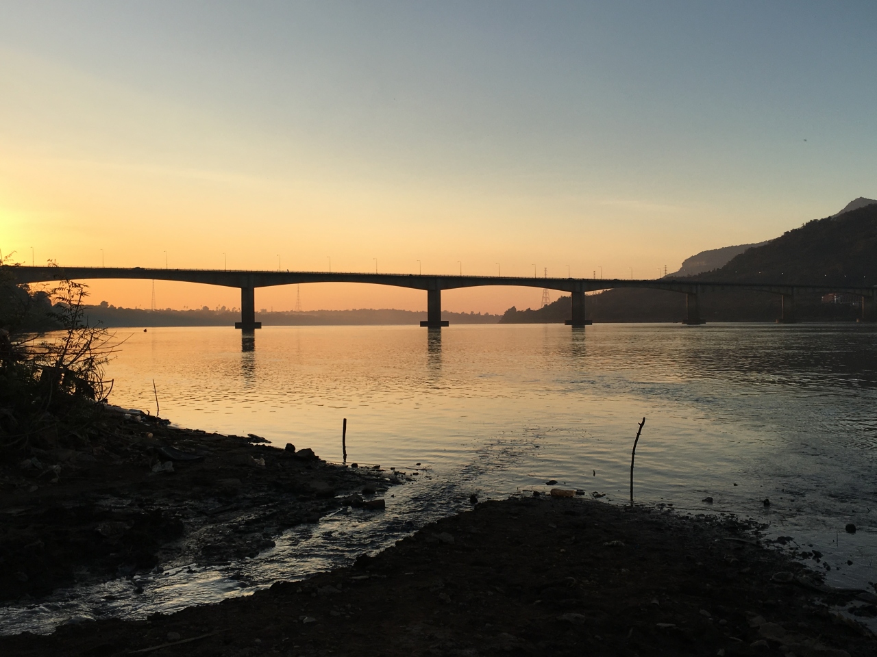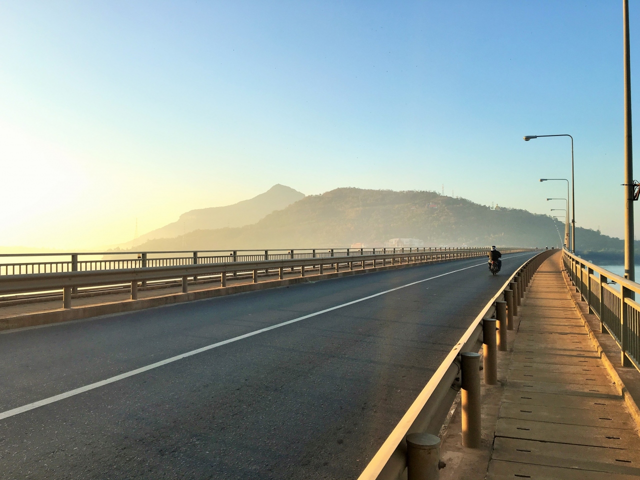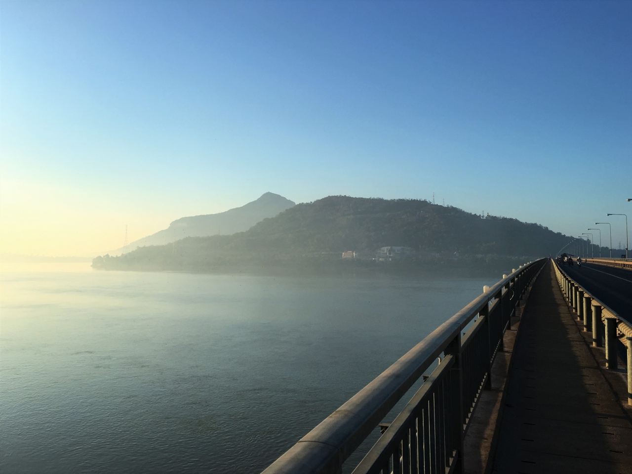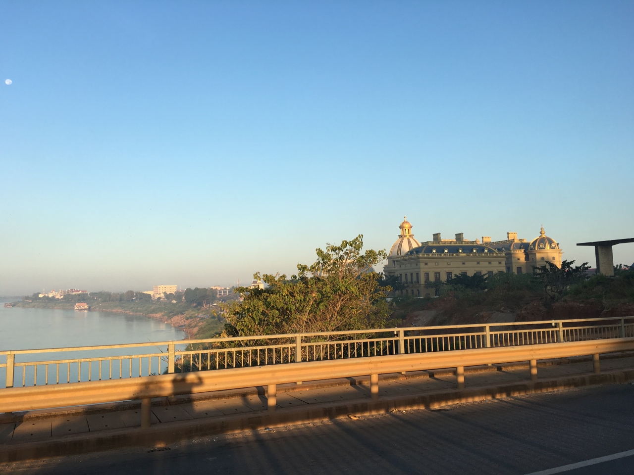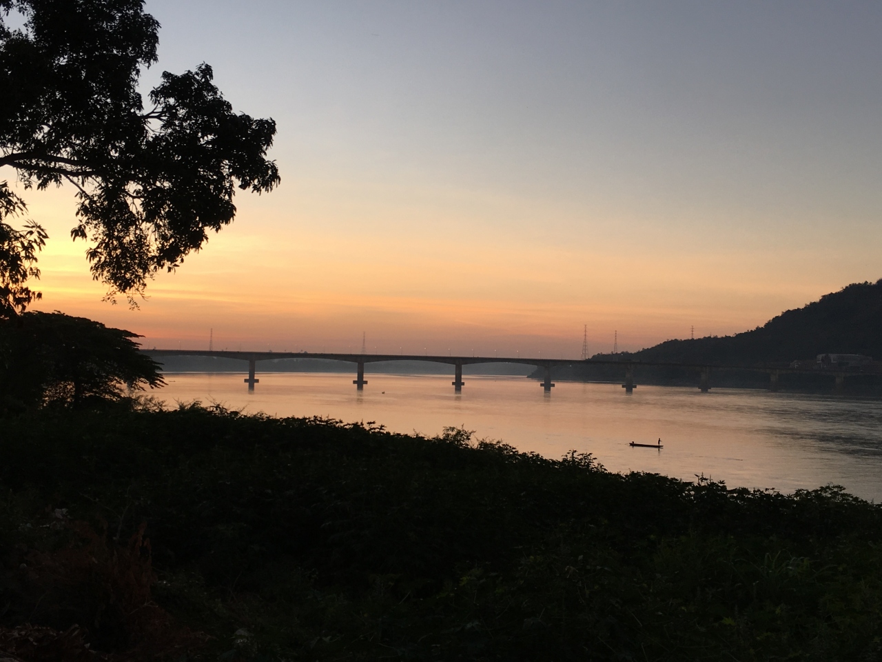 朝にメコン川沿いの散歩をしていると、橋の向こう側から朝日が昇って水面が光りとても綺麗です。また橋から眺める朝日~夕日はやはりメコン川とのコントラストが美しいです。
