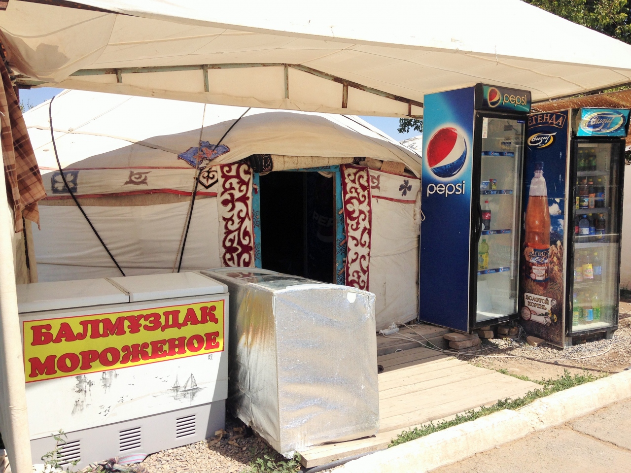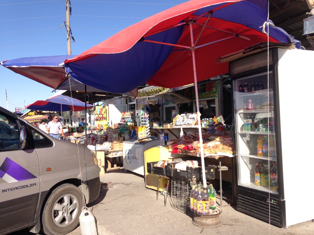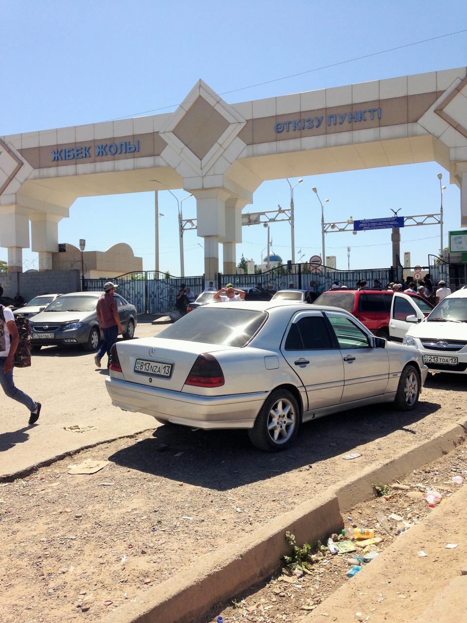 シムケントからは、アイラ・バスターミナルというおそらくシムケントの町の北側にある小さなバスターミナルから出発しました。マルシュは人集めに時間がかかりそうだったため、サービスタクシーの利用です。料金は確か1000テンゲほどだったと思います。国境までの所要時間は2時間ほど。国境の手前には両替商や商店などがあります。