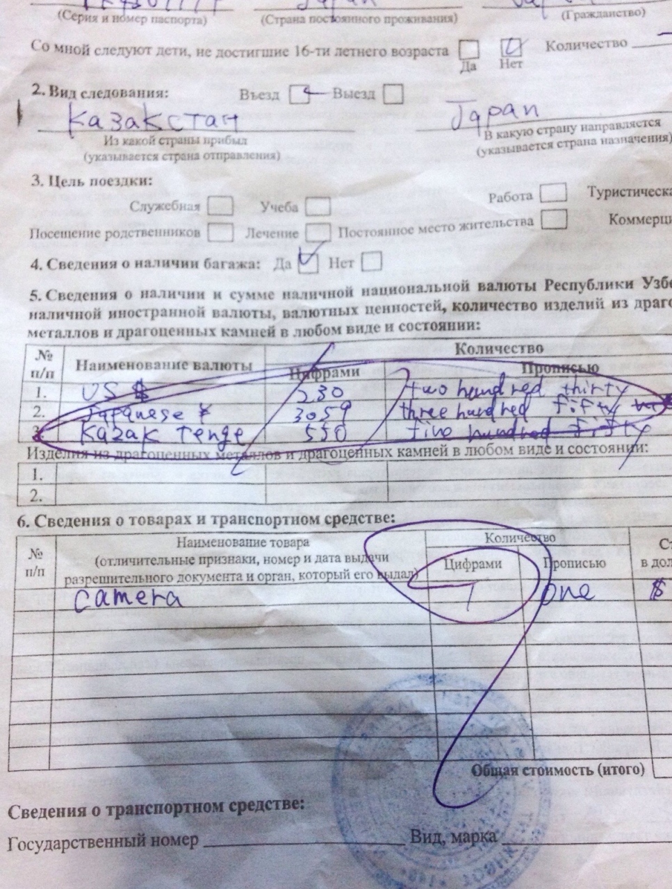 問題はウズベク側の入国で、中央アジアの中でも一番面倒でした。まずビザチェックから始まり、これは少々並びますがビザ所有者なら問題は特になし。その後税関に提出する書類の記載が大変で、手持ち通貨すべてを金種・金額までぴったり記入する必要があります…。自分の時はありませんでしたが、たまに財布をチェックされて確認されるようです。