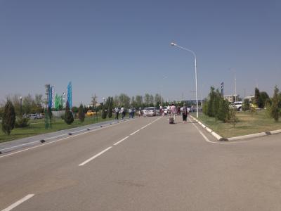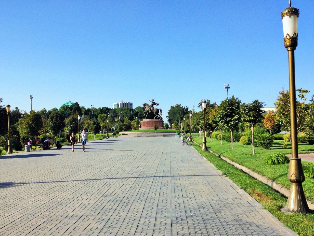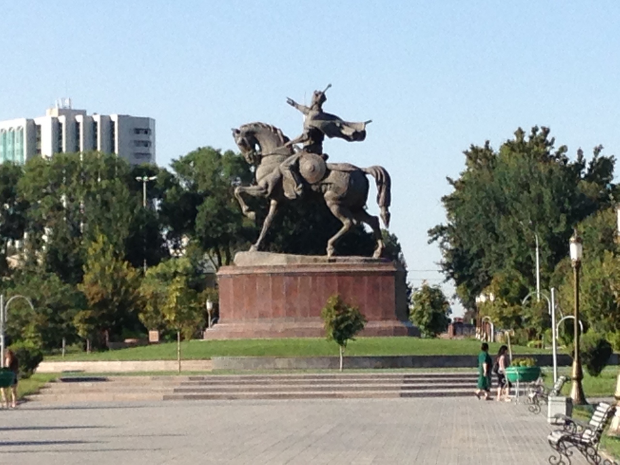 タシケントの中心部にあるティムール広場。大きな円形で放射状の通路が走るこの広場は、その名の通り中心にティムールの巨大な像が立っており、旧ソ連の共産主義的な計画都市の香りがします。