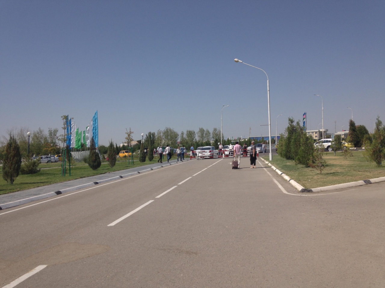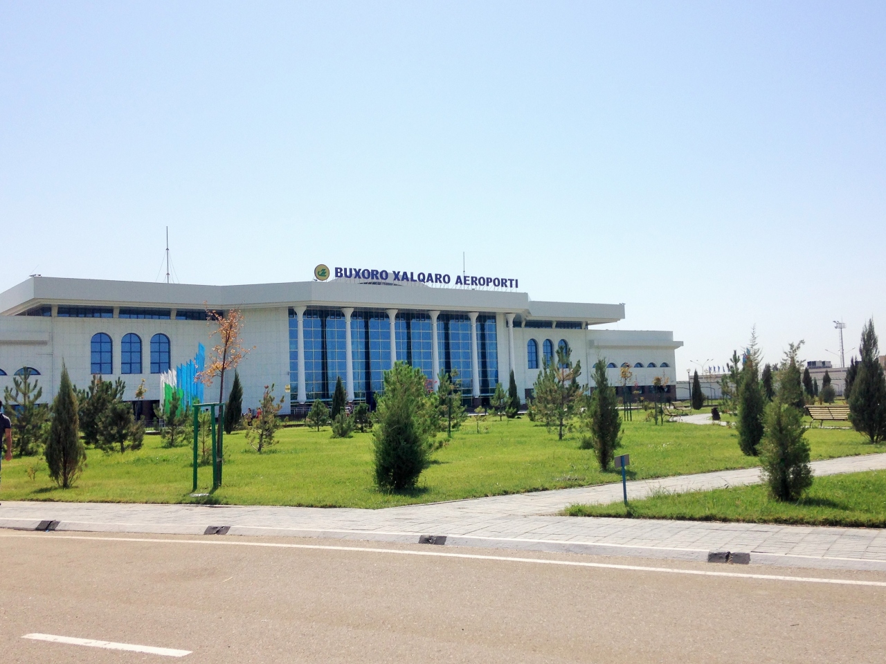場所ですがブハラの旧市街地からは東に6kmの距離にあり、タクシー利用が無難だと思います。料金は交渉次第で、空港から移動の際は飛行機の到着に合わせて外で客引きが待っています。一応街外れから空港⇔旧市街地間の公共バスが出ており、700スムで乗れます。駅を出て正面の道を真っ直ぐ行くと大通りに着き、そこでバス(マルシュ)を拾えます。