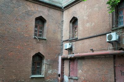 近くにいくとそれらしい古めかしい赤煉瓦の建物と、観光局の立てた案内板があるのが目印です。現在は市場や会社が入っており、内部に入ることはできません。
