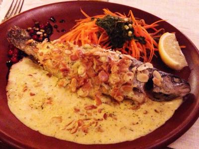 メイン…Muka ganenis(マスのクリームソース、アーモンド添え)11.8€