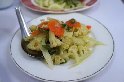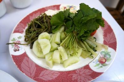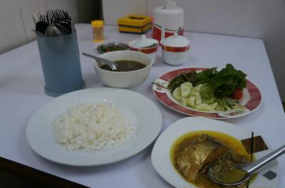 おかずを選ぶと、米・スープ・モリモリな生野菜・漬物的な食べ物が無料でついてきた。これは他のローカルなミャンマー料理屋でも同じだったので、こちらでは一般的な形式だと思われます。