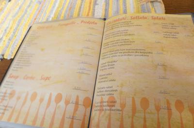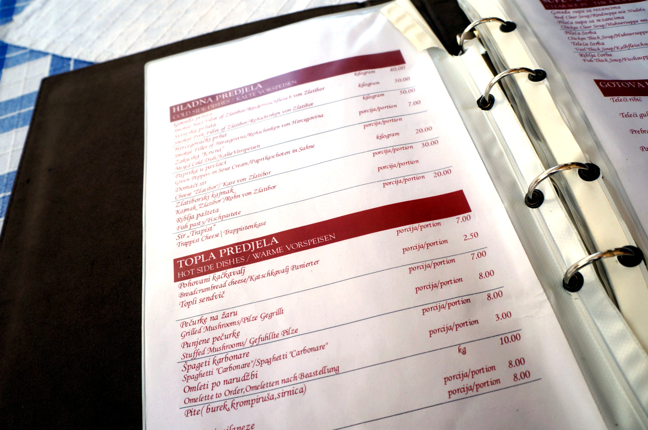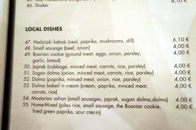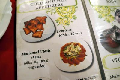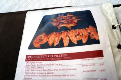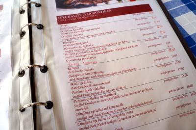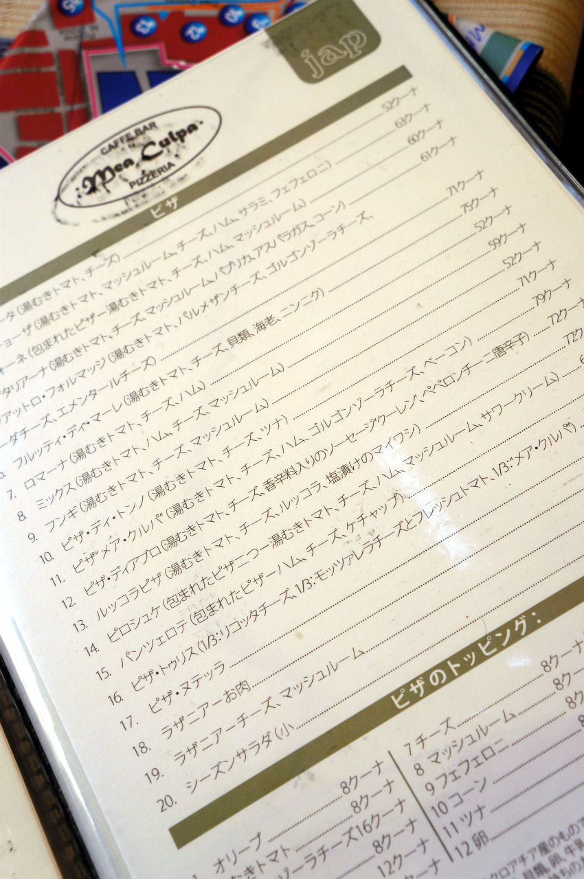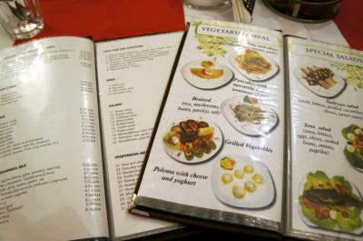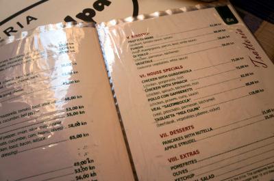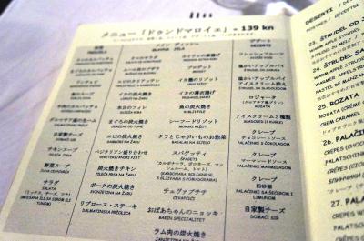 夜はコースでの注文がお得。前菜・メイン・デザートで139kn(=\2000)、それぞれ10~20種類の選択肢があるので迷ってしまいます。また物価高のドブロでは良心的な部類に入る。日本語メニューもあります。