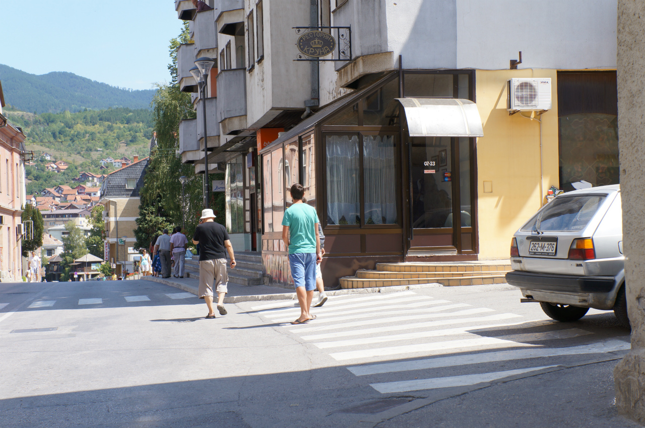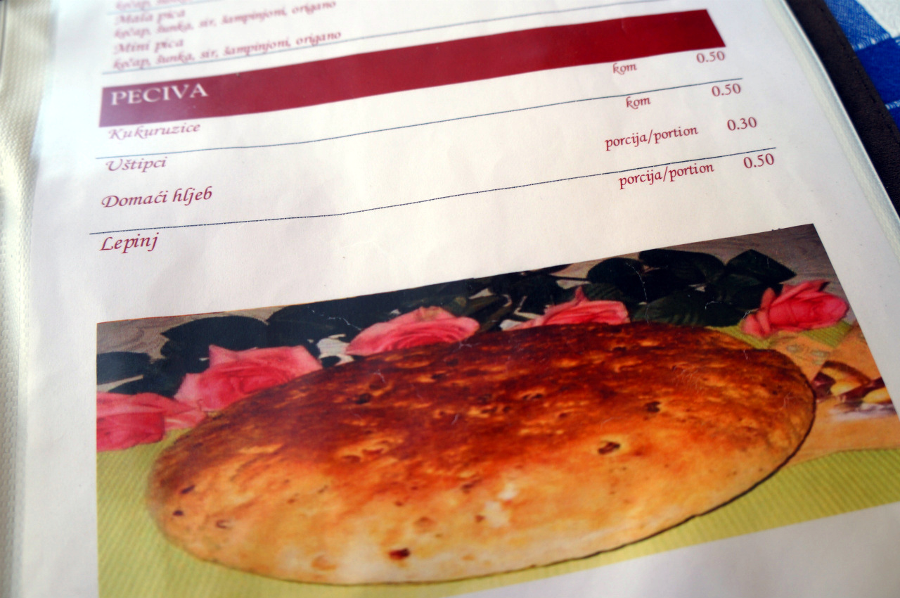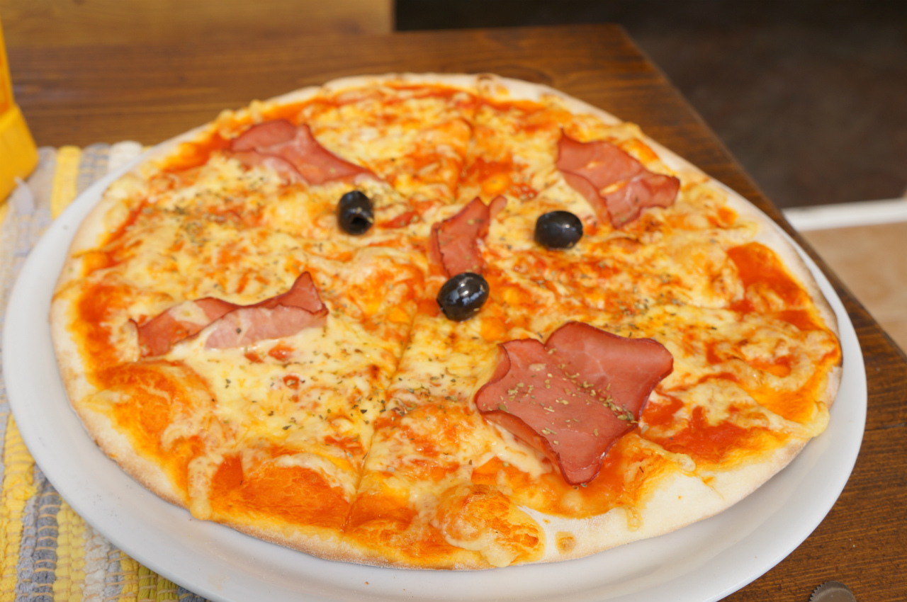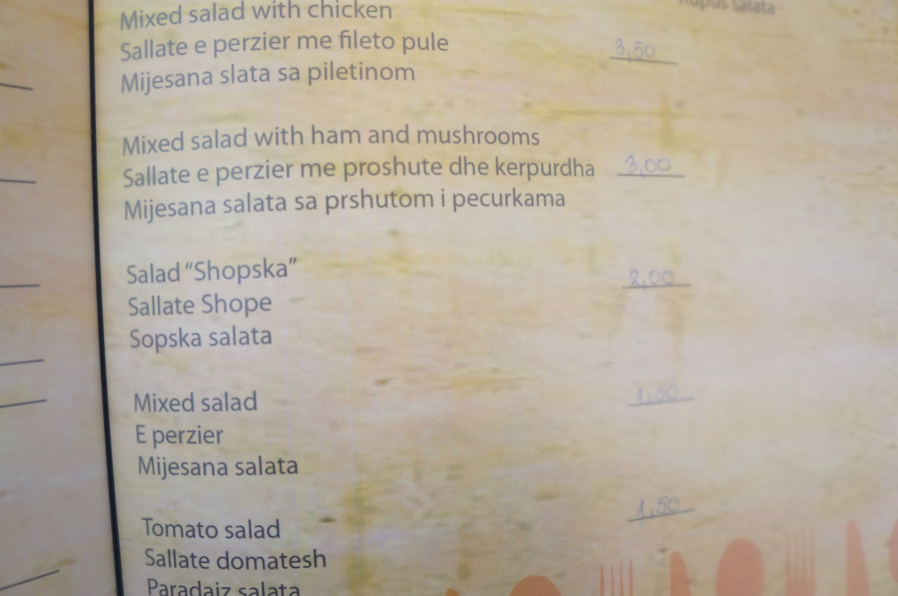 ここではショプスカサラダ=白チーズと夏野菜を使ったサラダ(2ユーロ)、ハム&オリーブのピザ(5ユーロ)を頼みました。さすがに物価は安いです。味もまずまずでした。