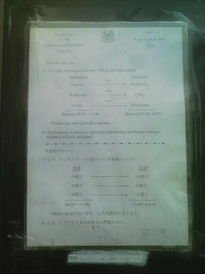 ・赤坂の在日シリア大使館で申請を行います。時間が限られているので注意してください。