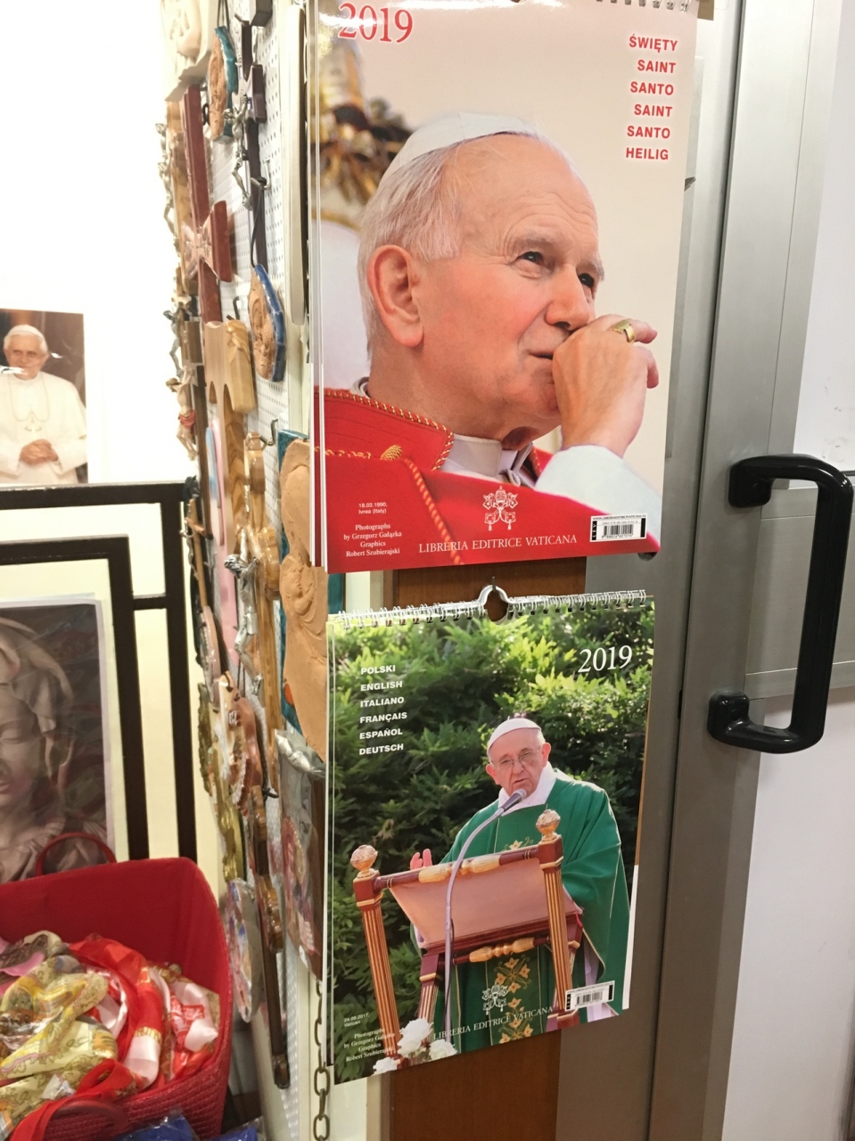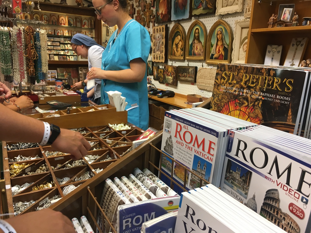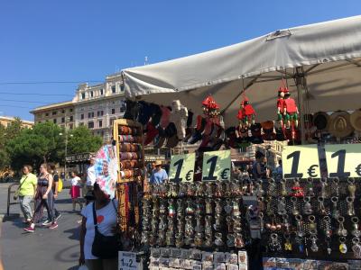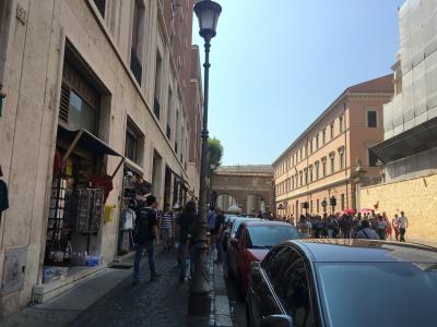 沿道には法皇さまや神様グッズをはじめ小間物店やレストランなどが並び、まさに参道といったところです。ちなみにこの通りはローマで、サン・ピエトロ広場に入ったところからバチカン市国になります。- 旅行時期
