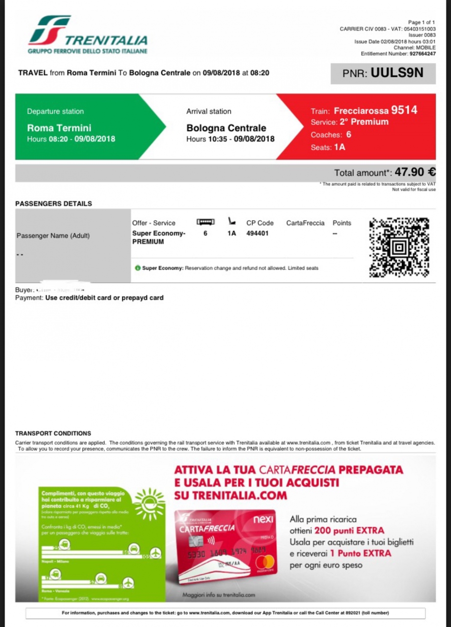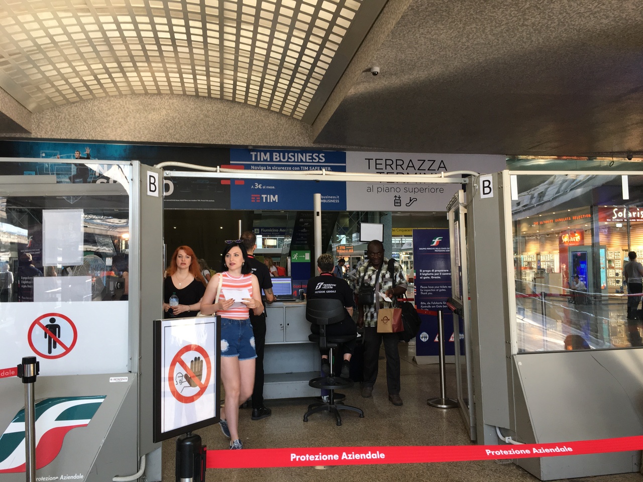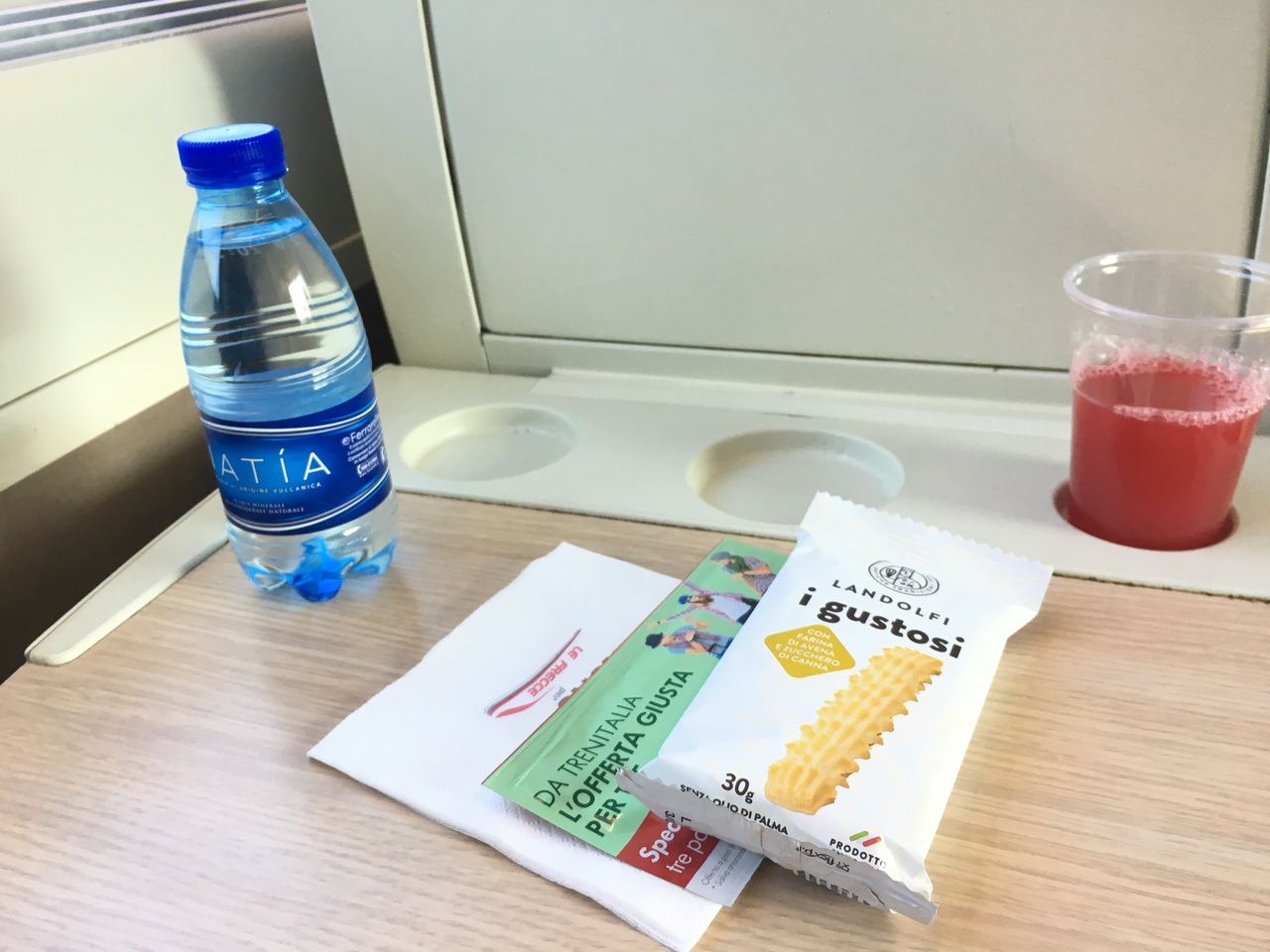 今回はローマ→ボローニャをフレッチャロッサで移動しましたが、2等なれど乗り心地も良くノーストレス。お菓子や水に飲み物、新聞紙までいただけて満足です。料金はスーパーエコノミーで47.90ユーロ。ローマは改札口があり、乗る前に有人のチケット確認があります。