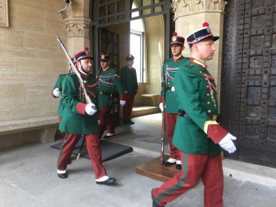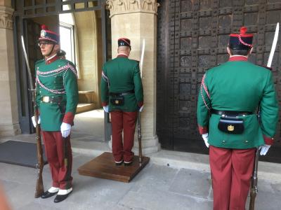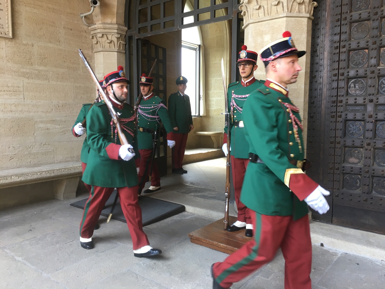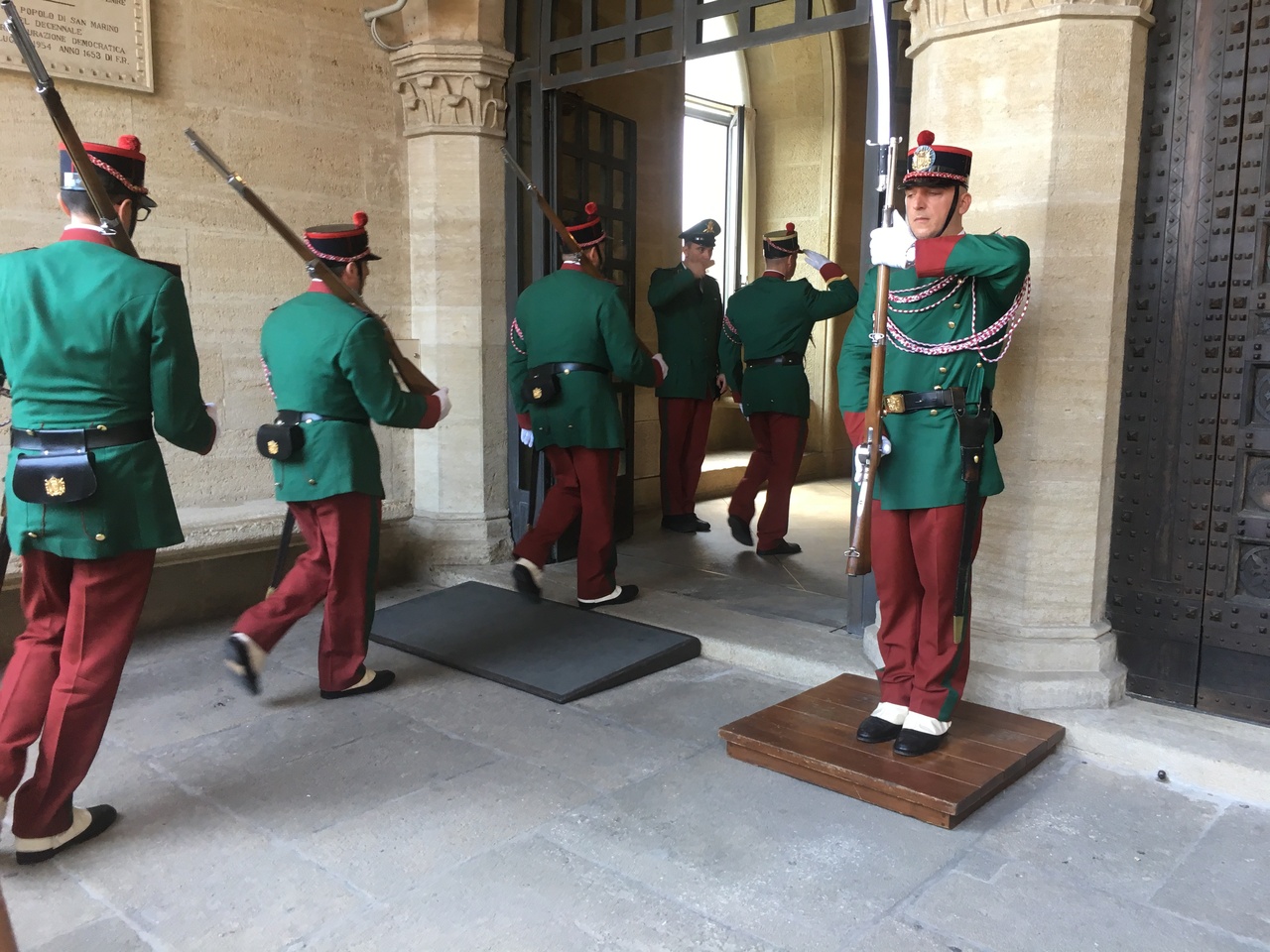 サンマリノの中心部・リベルタ広場に建つのがサンマリノ政庁舎。ここでは60人の議員でサンマリノの市政が行われていますが、なによりも有名なのが衛兵交代。5~8月の8時半から18時半までの各30分ずつで衛兵交代の儀式が見られます。