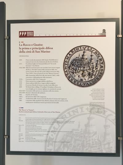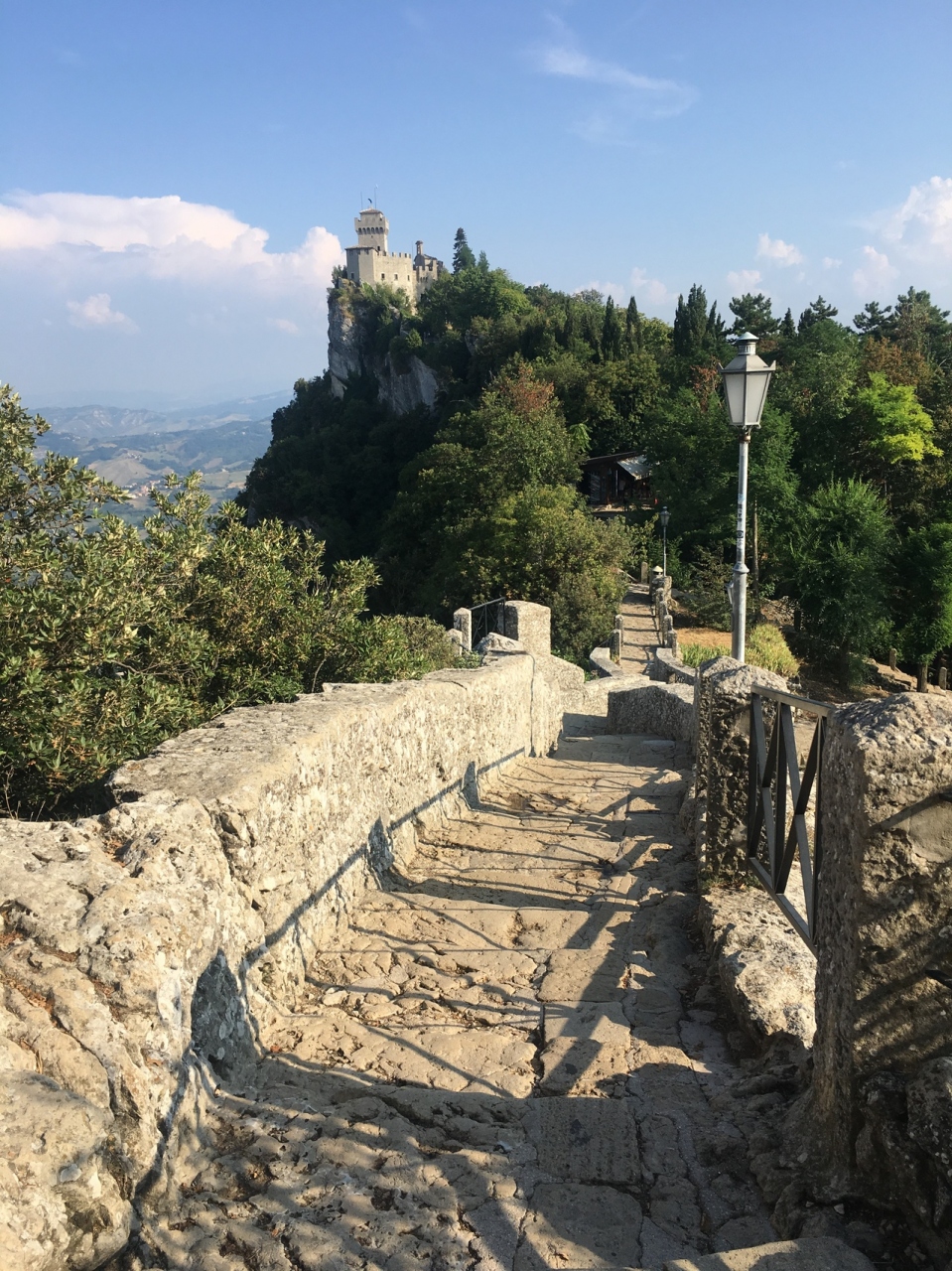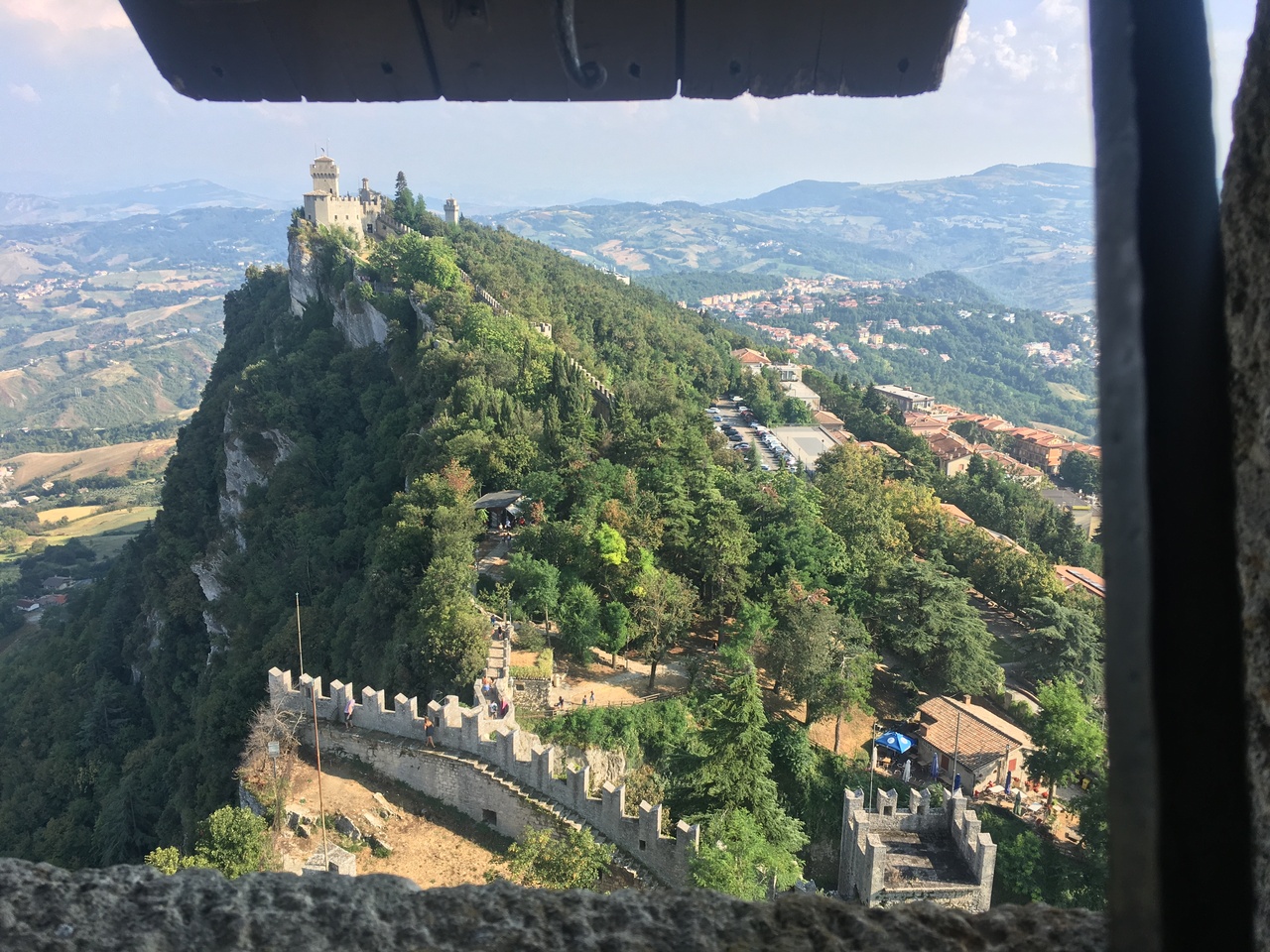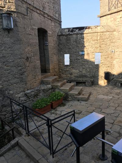 サンマリノに建つ3つの要塞=スリーシスターズのうち、市街地から最初に着くのがこのグアイタ塔。とてもしっかりした作りで広く、教会なども内部にあります。こちらから眺める第2の塔がいい感じですが、眺め自体は第2のチェスタの方がいいです。