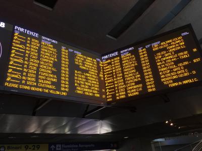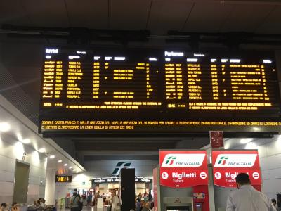 一番早いのがフレッチャロッサ。新幹線のように完全に高速線を走るため、時間もほぼ正確です。ルジェントは高速線と在来線を、ビアンカは在来線を走るため、こちらは在来線の遅れなどの影響を受けやすいです。イタリア国鉄はイメージよりも遅延は少ないですが、結構な時間の遅れも見られます。