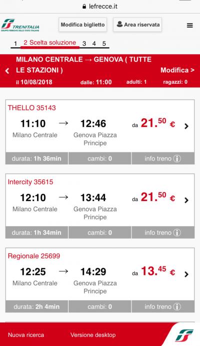 ミラノからはLa Spezia行きのICに乗り、ジェノバで途中下車しました。乗車数日前にトレニイタリアのHPより直接購入し早期割引ありで21.50ユーロ。メールで送られてきた乗車券をスマホ表示で見せるだけで乗車OK、プリントアウトしなくても大丈夫でした。