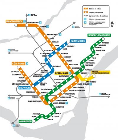 観光にも便利なモントリオールの地下鉄は、4路線のシンプルな構成。すべて色分けされていてとても分かりやすい。