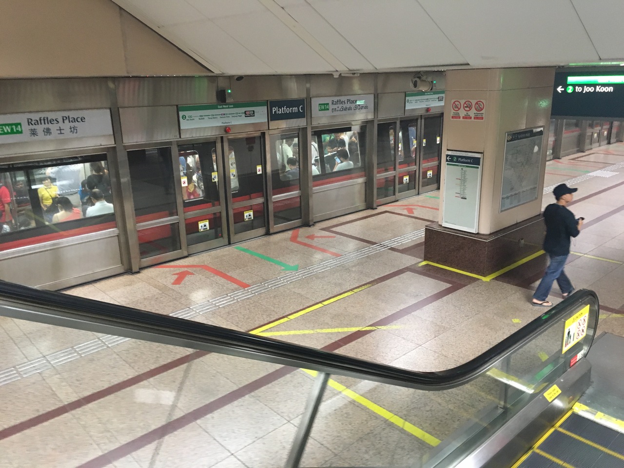 東南アジアの地下鉄は、欧州などに比べて快適ですが、ここシンガポールの地下鉄も乗り心地良し。注意点と言えば、車内飲食禁止で罰金を取られるため、ペットボトル等はカバンにしまっておきましょう。