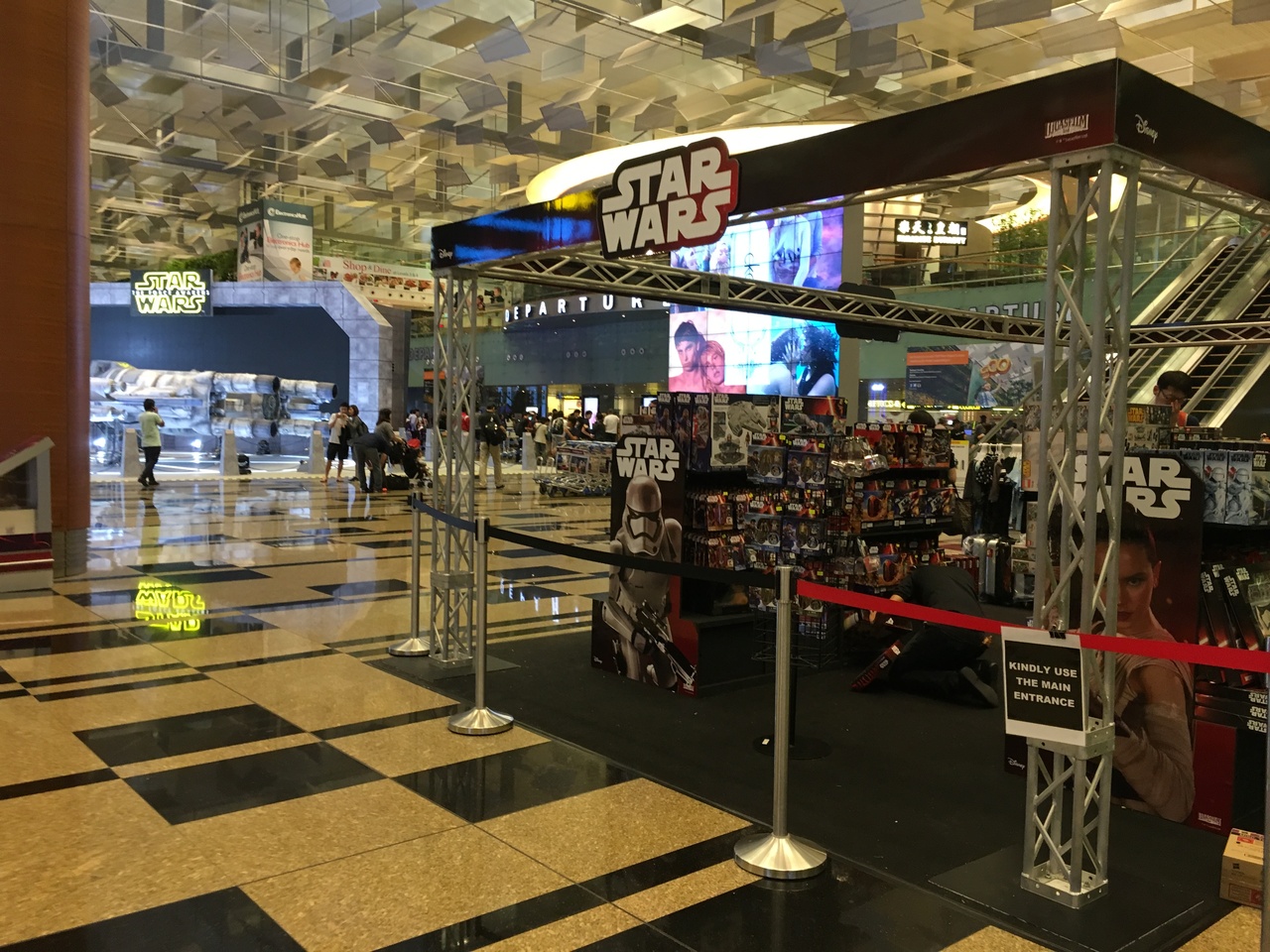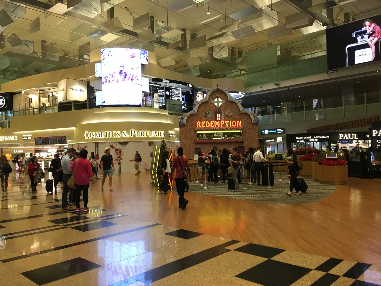 ショッピングだけでなく、フードコート、無料の映画館、プール、スパ、マッサージ、庭園などのたくさんのエンターテイメント施設があり、もはや空港ではなく一大アミューズメント施設です。