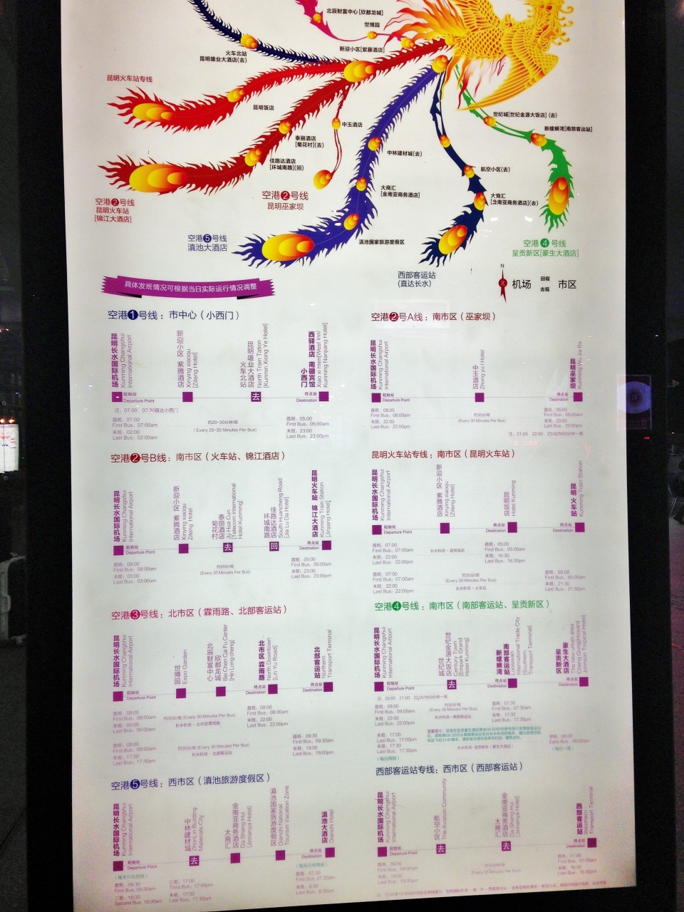 昆明~元陽行きの便を利用しました。市内からのアクセスはあまりよくなく、最近やっと地下鉄が開通したようですが朝早く/夜遅くは動いておらず、昆明の中心からは結局タクシー利用が一番早いです。昆明駅からここまで30元ちょっとでした。