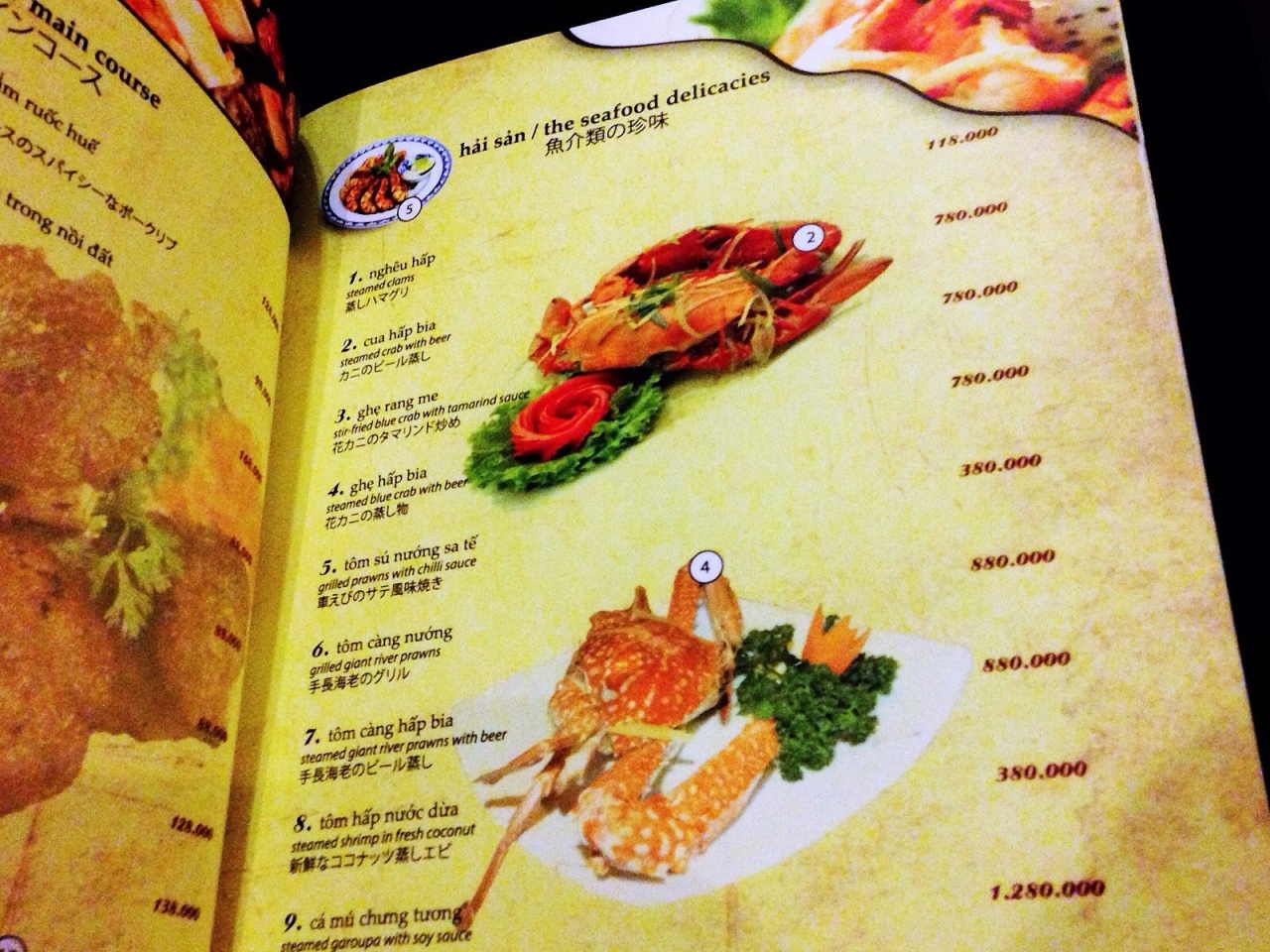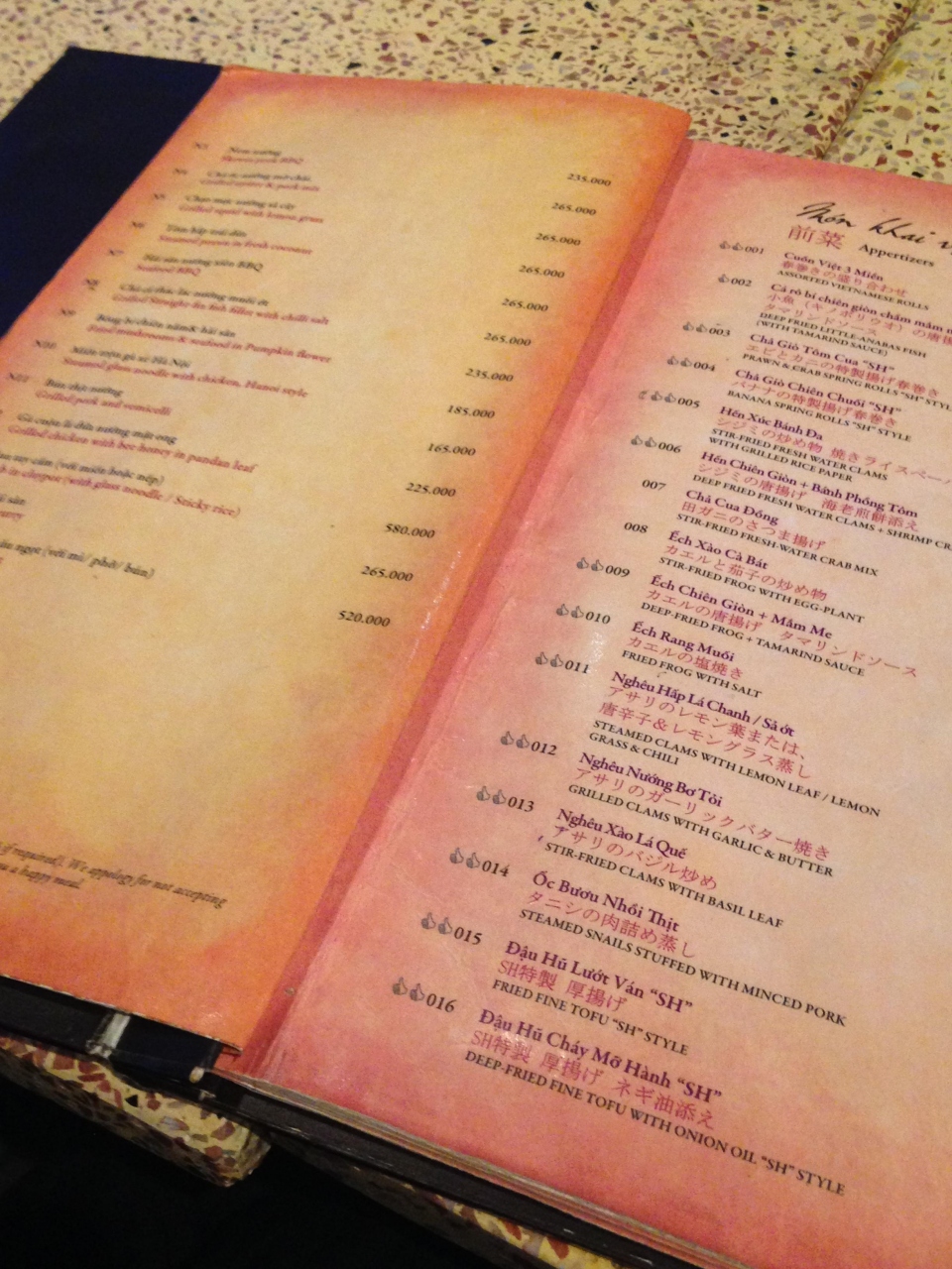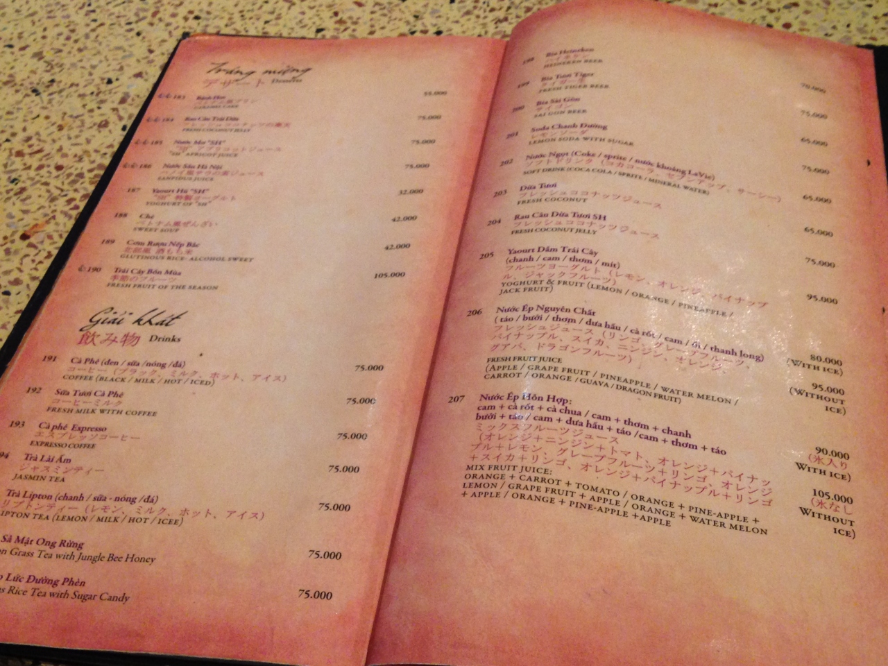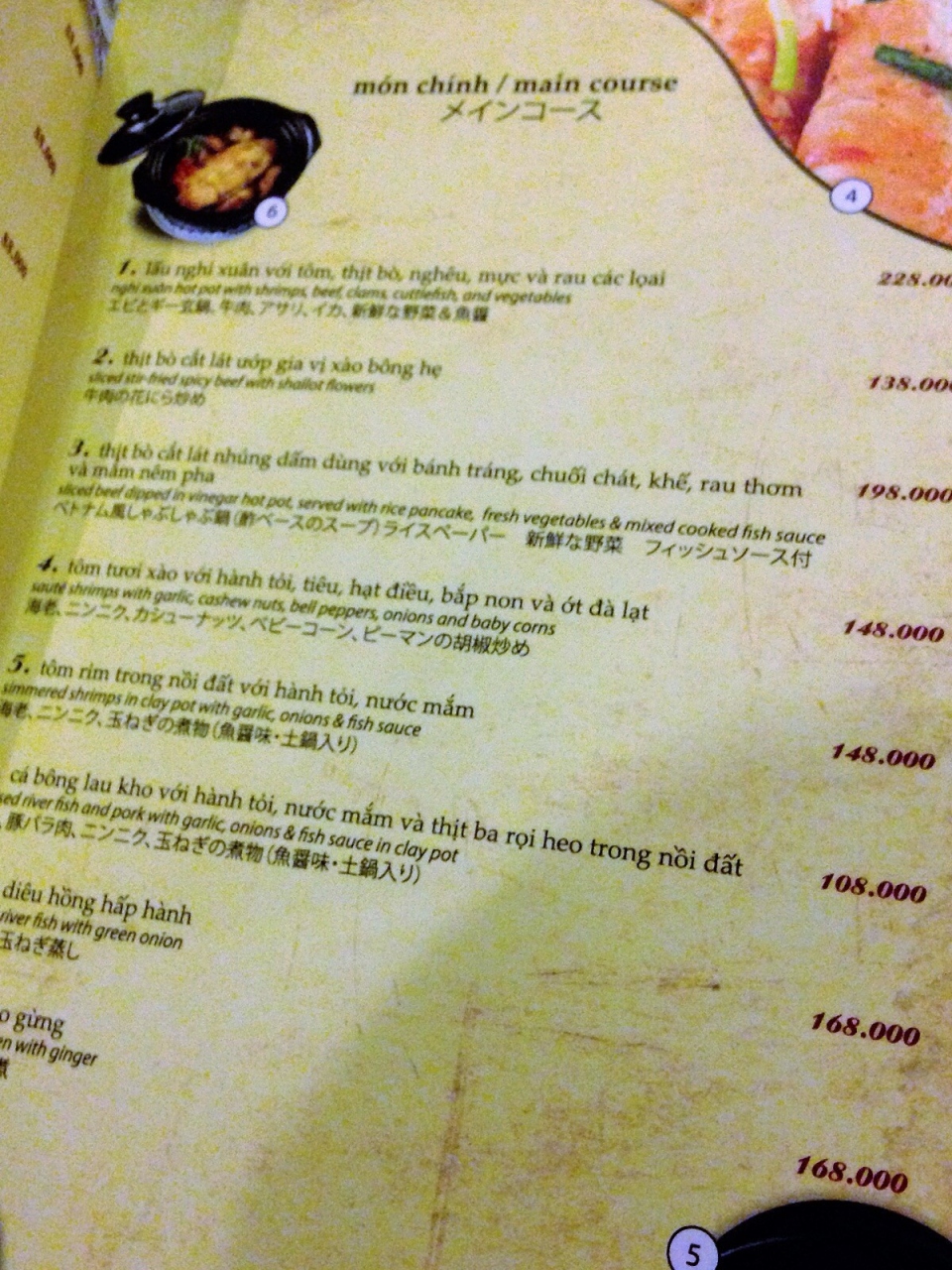 こちらも例にもれず、茶色を基調とした落ち着いた雰囲気のインテリアとサービスで、ゆっくりと食事することができます。お値段は普通のベトナム料理よりも少し高い位ですが(メニュー写真参照)、クオリティは高く上品に仕上げてくれます。男性と行っても大丈夫な雰囲気です。メニューには日本語記載有で安心。