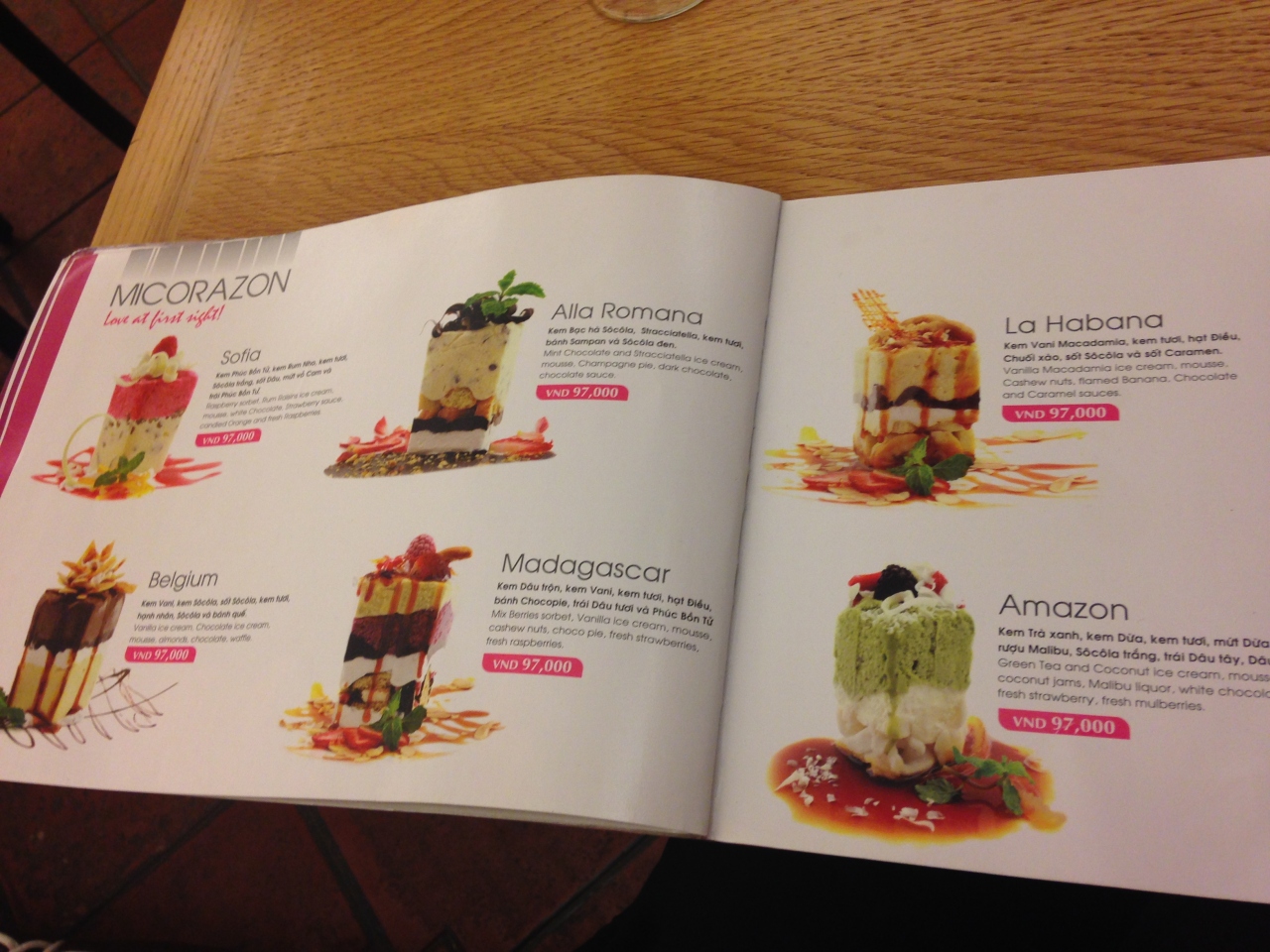 HCMでアイスやスイーツを、と言えばまずこのお店。種類豊富で色とりどりのアイスクリームや甘物類のメニューに、フランスを意識した色彩とインテリアの店内。これを嫌いな女性はいるのだろうかという位です。