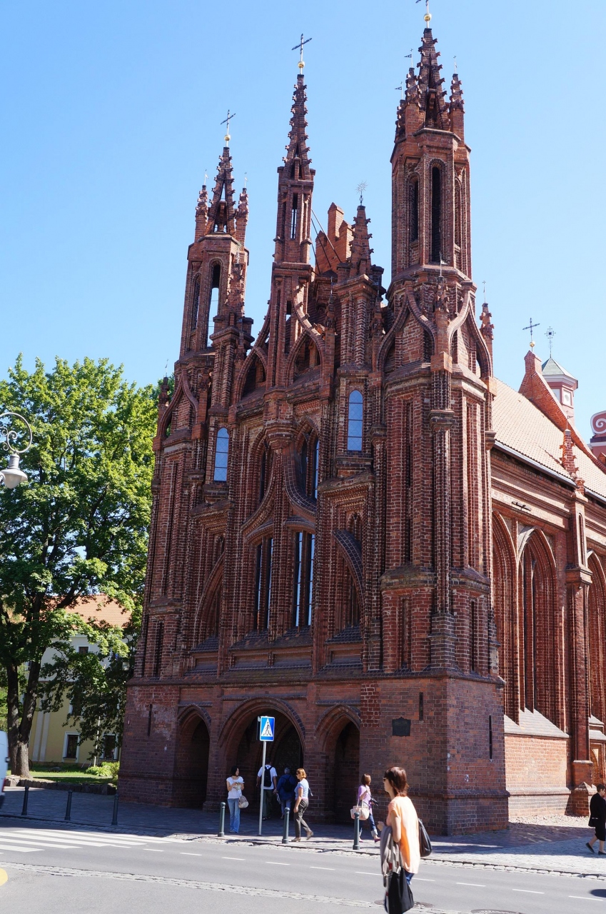 ヴィリニュス旧市街地の中心部・旧市庁舎広場のすぐ東側にある教会です。街並みに溶け込んでいますが、頭の上に王冠が乗っており目印になるかと思います。