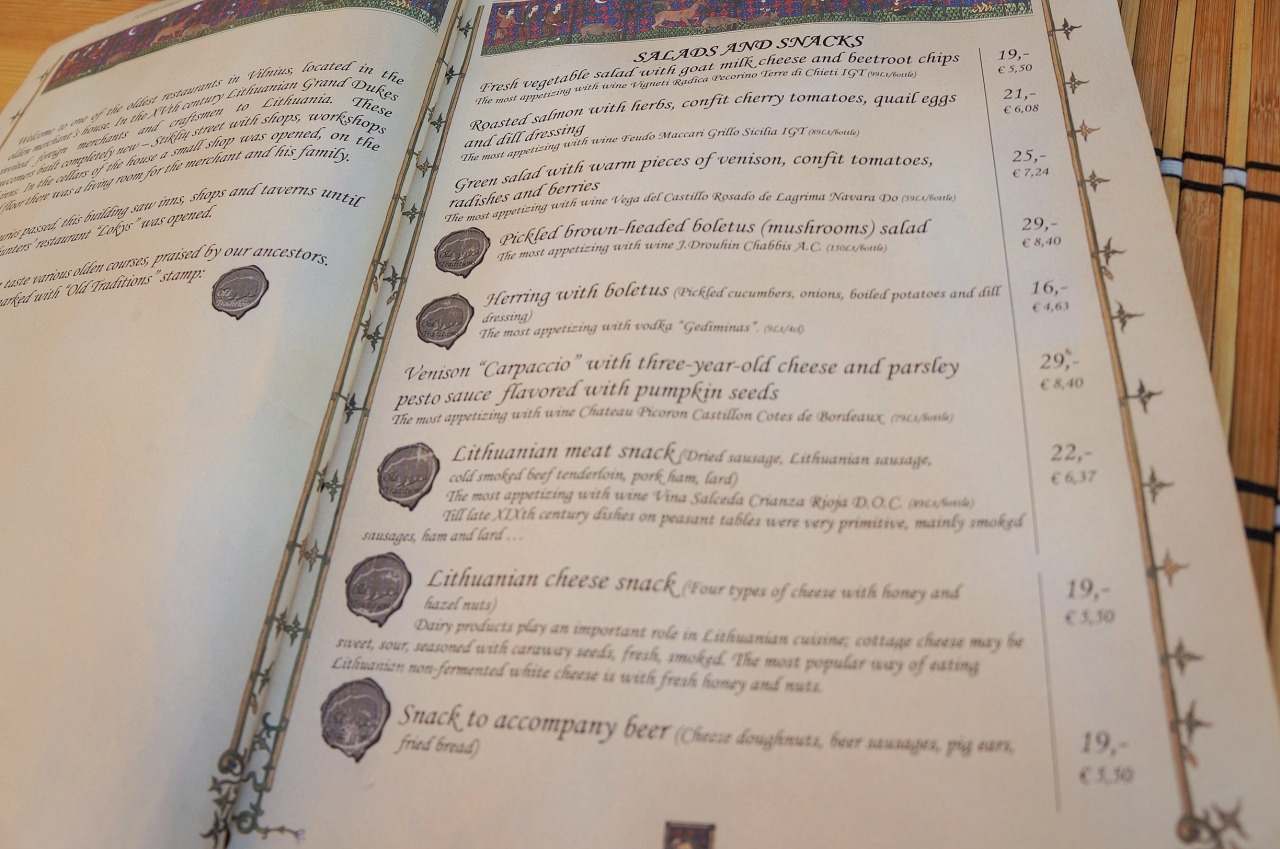夏にジビエって季節外れじゃないかな…とのこちらの思惑を裏切って、メニューに並んでいたのは野生の鹿、猪などの肉料理!リトアニアの猟の法律がどういう仕組なのかは分かりませんが、とにかくシーズンオフでも野禽が頂ける模様。