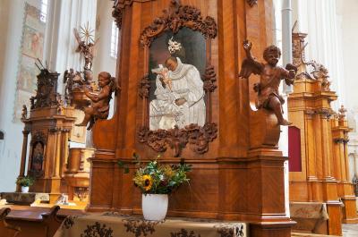 その後ヴィリニュスの支配者がロシア→ドイツ→ソ連と変わるごとによって、教会の宗派も頭の上の飾りも変えられていったそうです。最終的には1991年リトアニア独立後にイエズス会所属に戻りました。