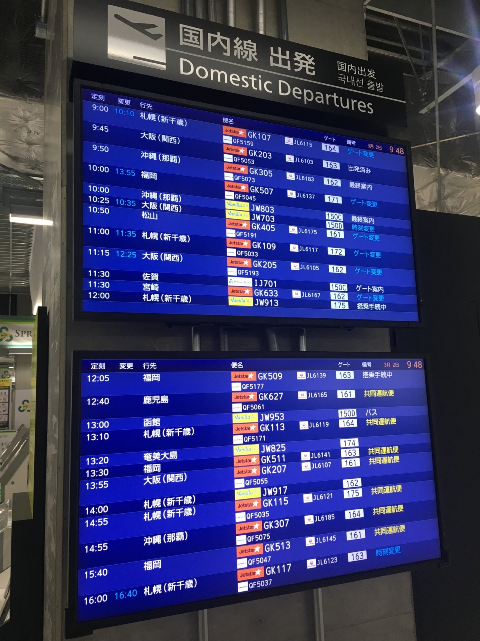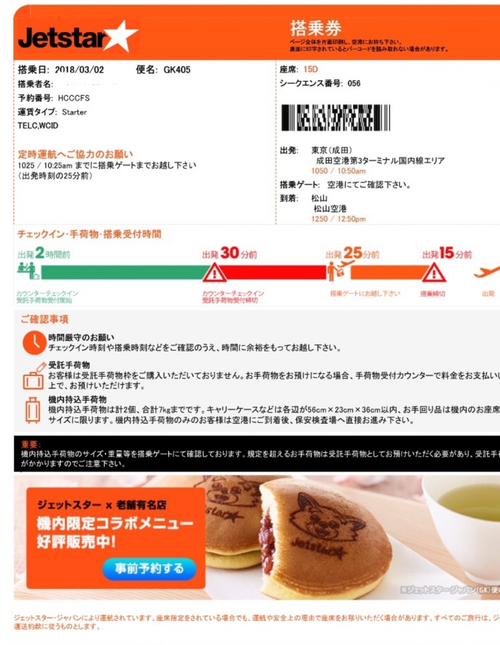 ジェットスター・ジャパン、2回目の利用は東京・成田3タミ→愛媛・松山空港行きの午前便でした。