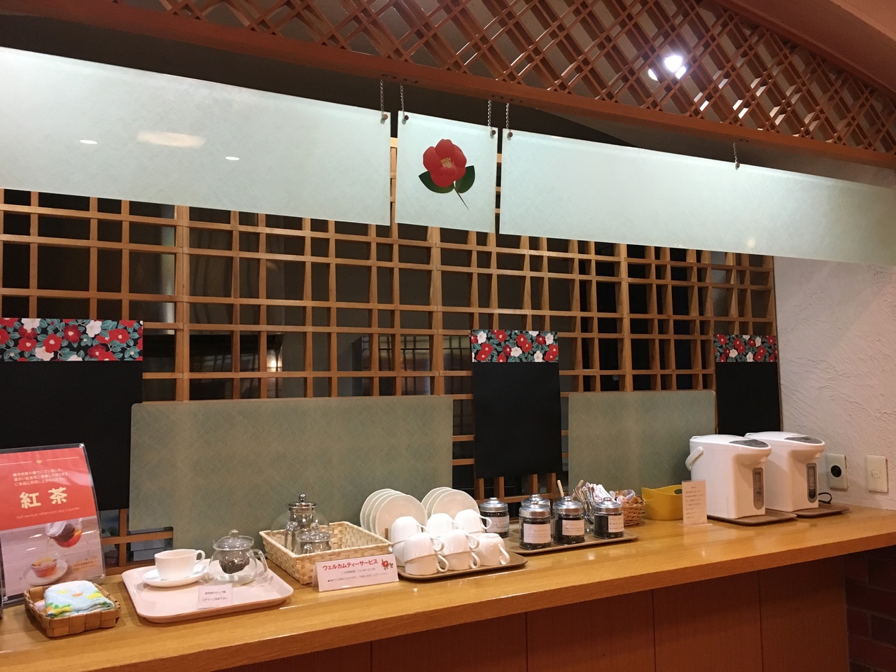 ロビーは大正浪漫風のステンドグラスにレトロな雰囲気で、5種類の紅茶が飲み放題のうれしいセルフウェルカムティーもあり、女性の心をガッチリつかんでくるサービス!その他浴衣や湯籠の貸し出しもあり、湯宿ならではの心配りにテンションが上がります。