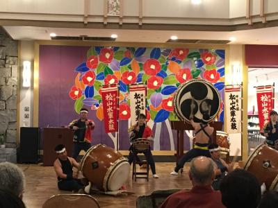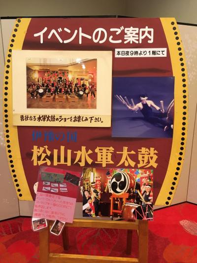 道後温泉近くの吹き抜けが印象的なホテル、圧巻の水軍太鼓ショー