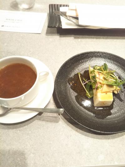 前菜のスープと豆腐の上にタケノコのったやつですが、