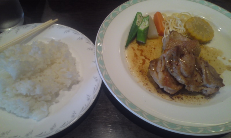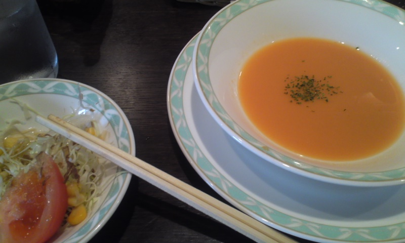 サラダに、冷製スープ、メインの若鶏のステーキ、